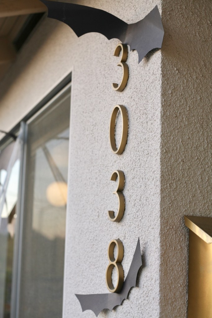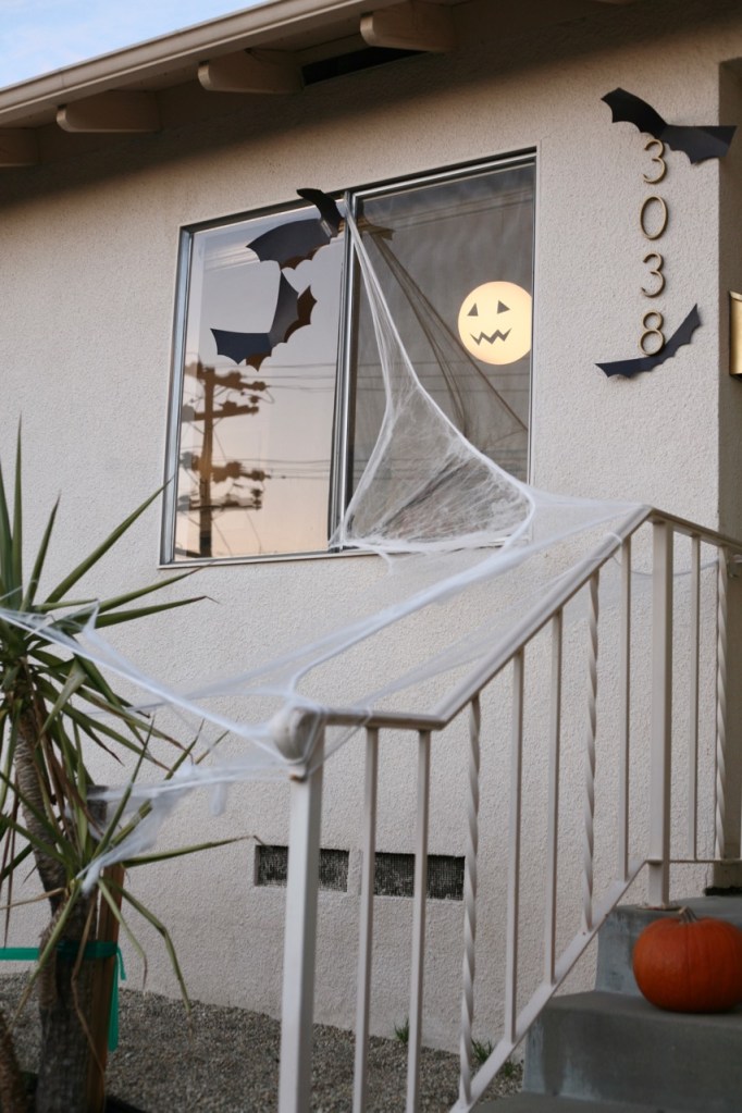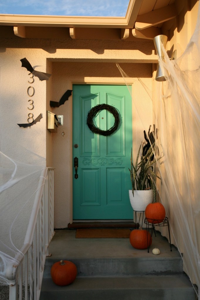 Trying to make this one small area of the front yard look festive for trick or treaters when the rest of the yard looks like a horror show. Budget Halloween porch: bags of spiderwebs, spray painted wreath, pumpkins, dead plant, hastily cut construction paper bats, and tacky jack-o-lanterned kitchen light. Ta-da!