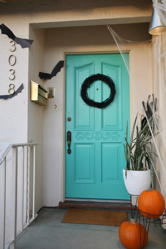 Trying to make this one small area of the front yard look festive for trick or treaters when the rest of the yard looks like a horror show. Budget Halloween porch: bags of spiderwebs, spray painted wreath, pumpkins, dead plant, hastily cut construction paper bats, and tacky jack-o-lanterned kitchen light. Ta-da!