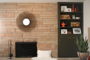 mid century fireplace shelf built in cabinetI’ve been putting in time in the family room, trying to get to a place where things just make more sense, but I’ve been stalled on this built-in cabinet. I’ll admit that it’s useful, displaying pottery hoards/Salton Sea relics in an uncluttered way up top and housing board games below. On the flip side, it competes with the fireplace and, while not the ugliest, is a far cry from the custom walnut shelves/walnut mantel/insane vintage light combo of my dreams. Considering the 100 other projects in line and the fact that there’s nothing really wrong with it as is, we won’t be bringing that dream to life any time soon, so I recently painted it to see for the interim. New paint coupled with the fireplace screen swap has this side of the room looking fresh.