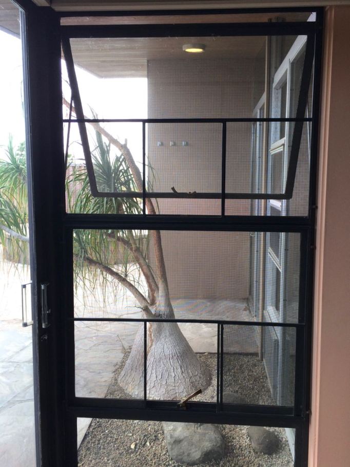 So, just some details I want to make sure you didn’t miss: First, that mega floating vanity/dresser/mirror in the master suite. It’s double-sided and sits between a wall of closets and the bathtub. The side pictured is a floating dresser and the opposite side features a floating vanity with a sink. The light switch is under the mirror frame! Second, all the original beautiful sconces, inside and out. I think one of my favorite things about this house is how cohesive it is. Every room, wall, corner looks like it belongs to each other because only a few consistent, though interesting and sculptural, materials are used throughout, the lighting being a great example. Lastly, that indoor-outdoor flow! Nearly every room has a wall that extends seamlessly passed a wall of glass. In the master it is the Douglas fir wall, the living and second bedroom have a rock wall, and even the master bath’s tiled shower wall extends into a private patio, where original towel hooks hang on the exterior side of the sliding glass door. Woooo-weeeee!
