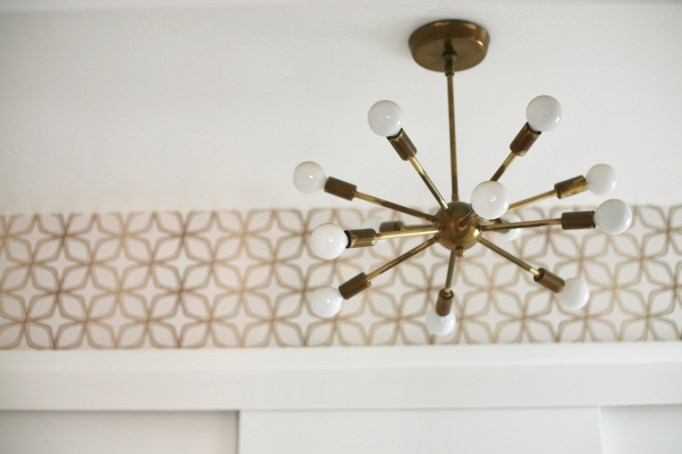 My third failure was measuring loosely or trimming too hastily and then coming up just short. Total amateur hour. I wasted a lot of time lining up sheets that ultimately weren’t big enough. Luckily, I was able to reuse most, but one that took a particularly long time and a lot of effort to get fitted ended up being 1/2″ too short at the baseboard…and it was end of the line where I knew paper was already running short. Baseboards replacement (with taller baseboards) is imminent so I left it, but I know it’s going to bug me until we get around to it. Otherwise, I have a few small bubbles and one tiny tear at a corner, but those were all to be expected, so they aren’t driving me crazy.The paper, by the way, is Norwall SH34552 and so adorable. Wallpaper is a big commitment, but I’m confident I’ll love this print for years. It is just what I wanted…60’s feeling geometric, bold but not overwhelming. The price can’t be beat, nor can the pattern, but the defects mentioned above left a bad taste.