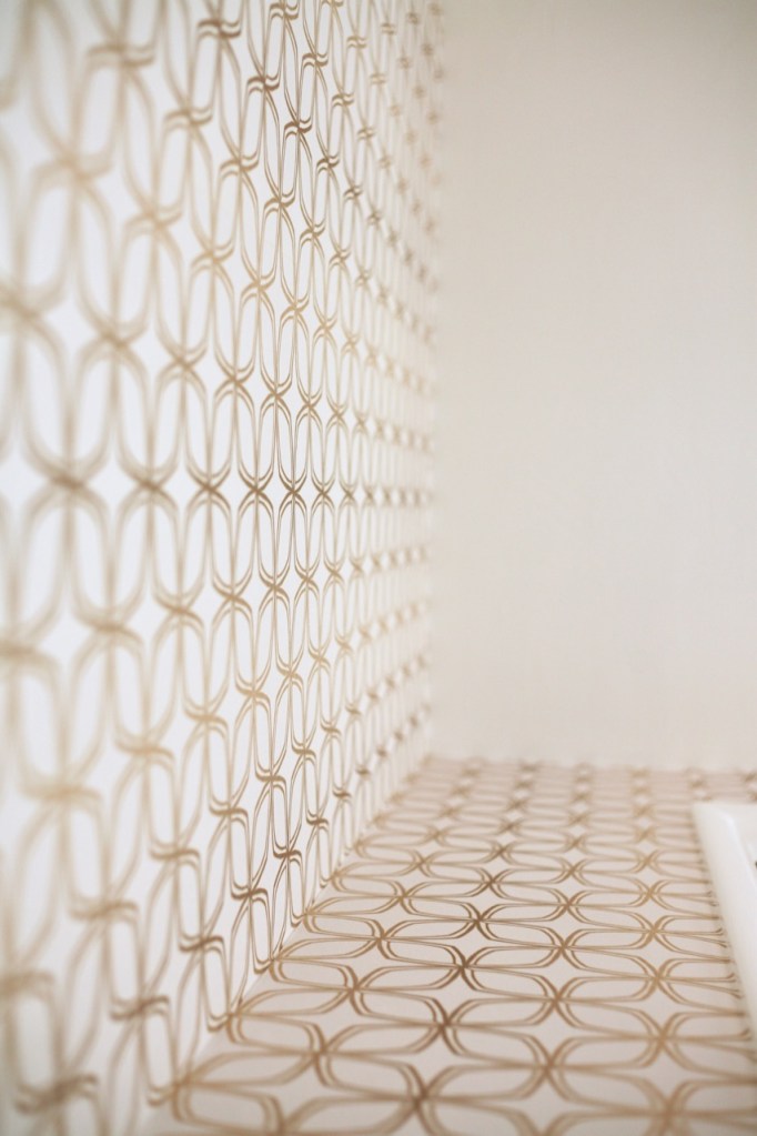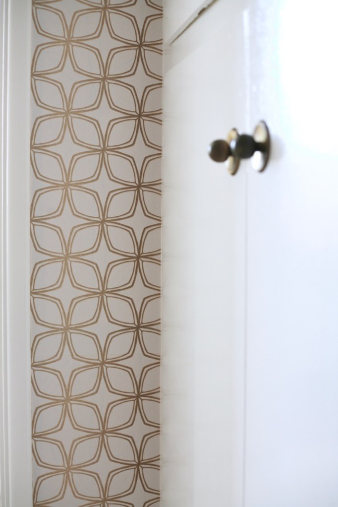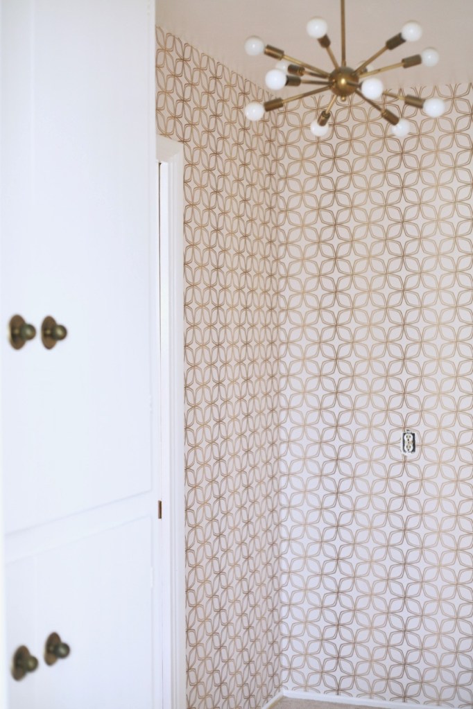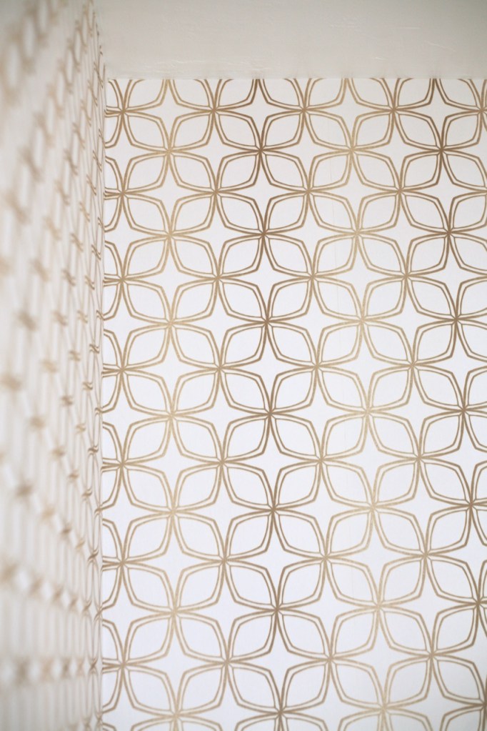 Mid Century Wallpaper DIY Norwall SH34552 gold white geometricI wallpapered our dressing room this week. I am so happy with the results but IT WAS THE WORST JOB EVER. What I thought would take 2 hours, took ten. These walls beat me down and broke me haha. Maybe it was worth it?!I previously had drawn bamboo all over the walls in here but was never happy with the wall I started with and never had the motivation to redo it. I thought wallpapering instead would be a fun opportunity to switch things up and take just as much effort as I’d use to repaint. HA. In hindsight, this room isn’t beginner wallpaper level and nothing is ever easier than paint. There isn’t a lot of wall square footage, so the work looked deceptively easy, but I neglected to account for the gazillion corners and cuts that were necessary and didn’t quite grasp the scope of matching and leveling geometric patterns.