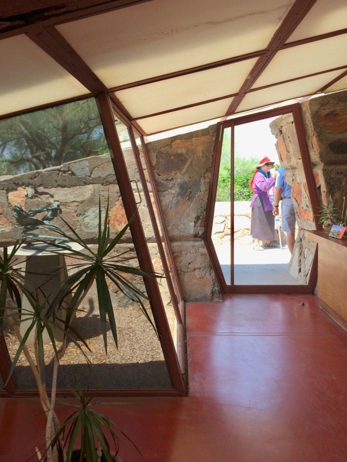 A little history. FLW was in his SEVENTIES when he began building Taliesin West in 1937, and the campus remained a work in progress until his death in 1959. Imagine! He had opened an architecture school, Taliesin, in Wisconsin in response to dwindling architecture business during the great depression. His (much younger) third wife, a behind the scenes string-puller from what I can gather, saw out of work tradespeople using the lull to take on apprentices and recognized it as a business opportunity for her husband as well. Taliesin West served as the school’s winter home.