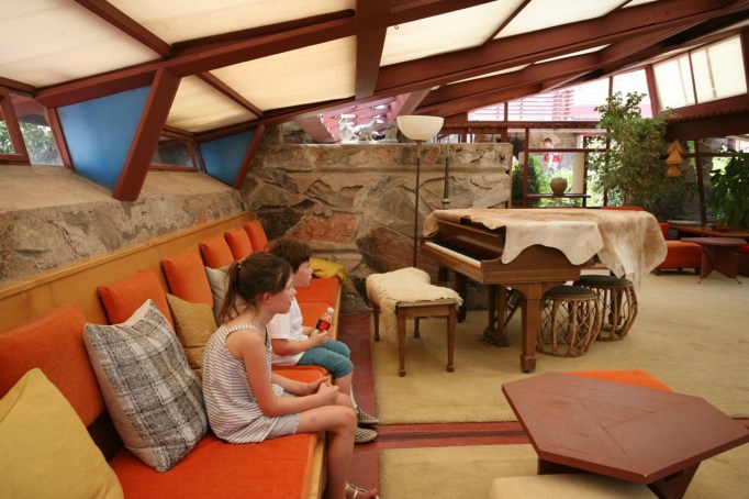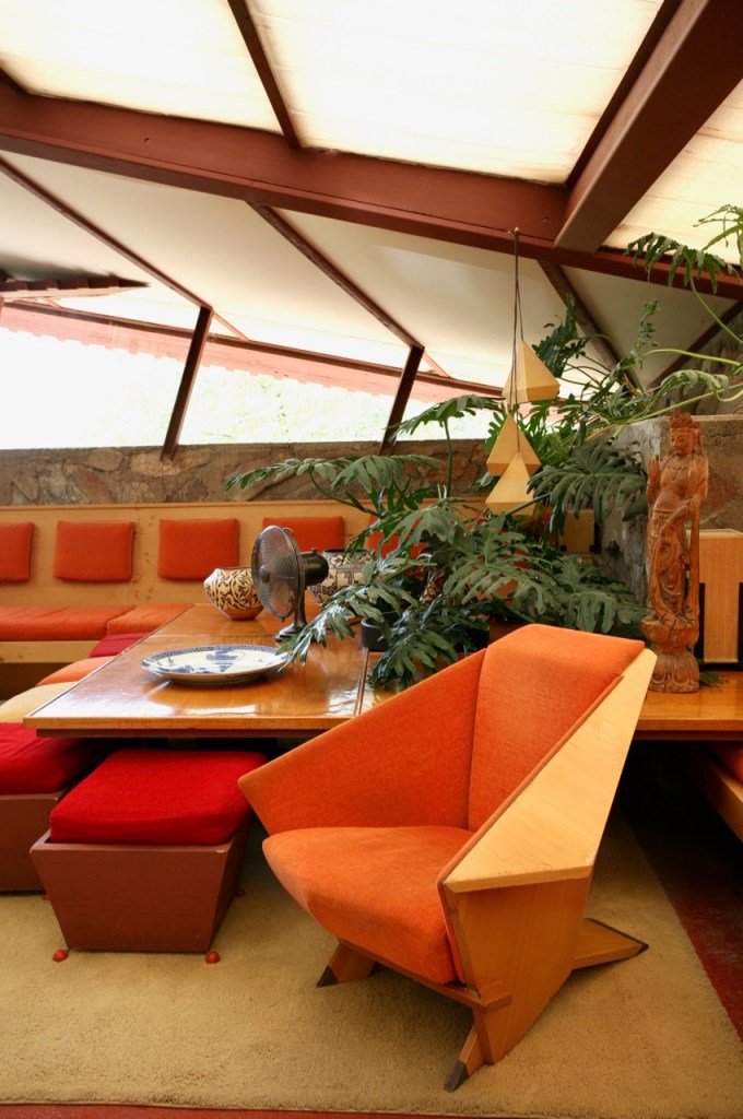 Then we reached the living room, AKA the Garden Room, used for Sunday social gatherings with the students, basically a lesson in manners and socializing and dancing (all the reasons I would drop out….). The furniture is futuristic, all Frank Lloyd Wright designs. I loved that it was a touchy tour and we could give the furniture a spin. What a lovable space!