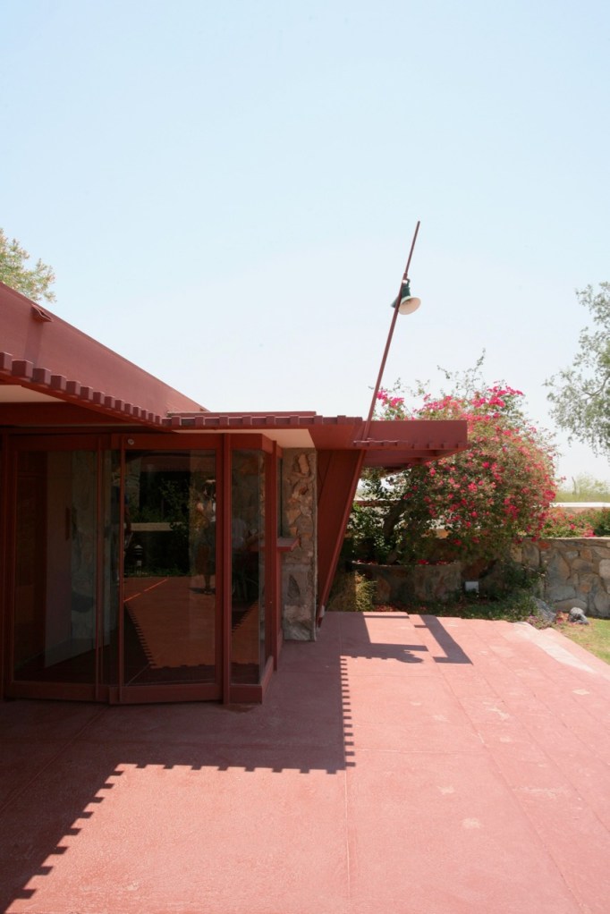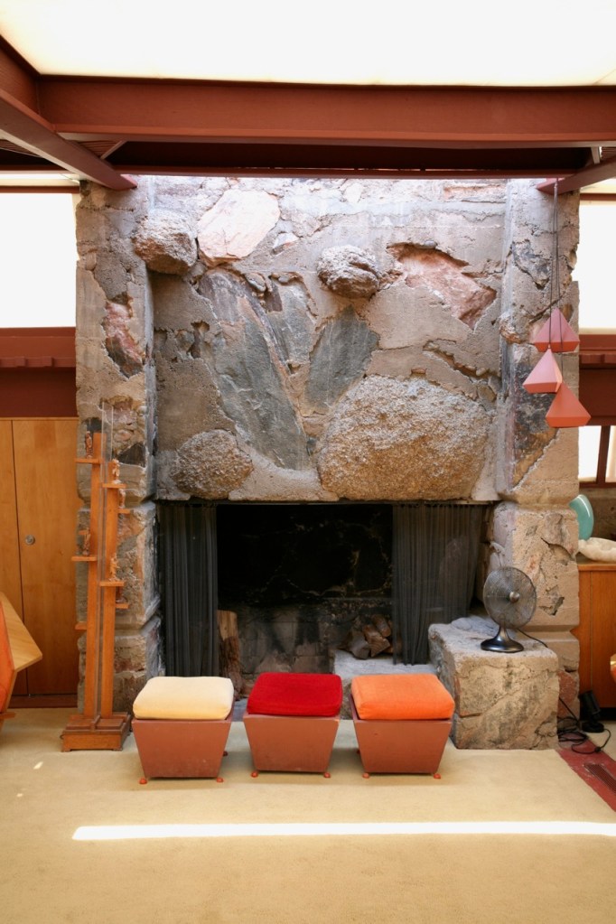 The campus was built tucked into the foothills on the outskirts of Phoenix. The actual forms, the walls, are strikingly beautiful, built with rocks found on site and concrete, making the building truly one with its land, as all organic desert modern structures should be. The most exciting thing about the design, to me, are the abundance of crazy angles. (And abundance of fireplaces…) Unexpected and wacky angles jut out all over the place. Even in doorways. And the doors are all short. FLW was a short guy and didn’t consider the height/comfort of those taller than him…or maybe it’s all just part of his compression/release masterplan.