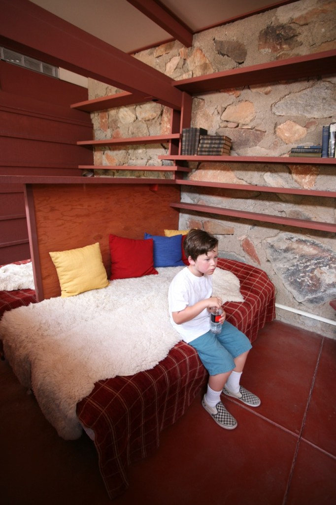 It was in his bedroom that a “highlight” occurred. We are all hanging out in FLW’s bedroom. Kids are laying on his beds. (Beds: The one on the left side of the partition is for uninterrupted sleep and one on the right signaled an okay-to-wake-me-if-you-need-me nap.) The adults are casually snooping around every corner, checking out the weird bed, the cool desk, the rock fireplace, the spacey aluminum bathroom. We walk out. A TW employee passes us on her way in and asks if we saw the rattler. That was apparently coiled in the corner of the fireplace the entire hang out. NBD. This may be an everyday occurrence to desert city dwellers, but I was so fascinated that the fire department was called in for the snake removal and relocation via snake grabber pole thing and bucket. Here is my kiddo contemplating life mere feet from a rattlesnake: