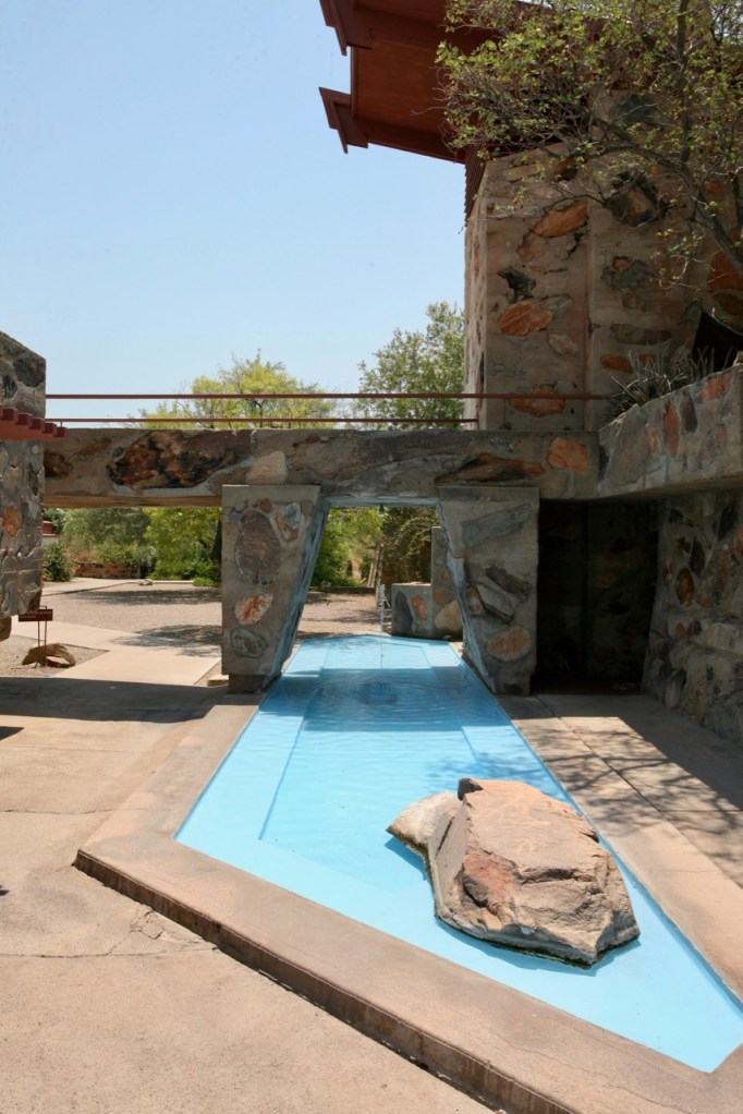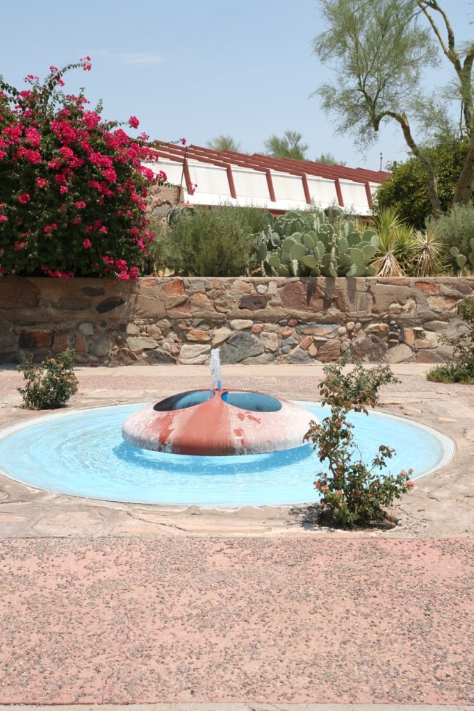 Next stop was this amazing courtyard/fountain, the Kiva pool, and then the Kiva, basically a filming room (FLW’s usuals: westerns) with dramatic lighting that was years ahead of its time. Well lights are built into the floors and hidden uplights create mountain-like shadows on the walls. The room itself isn’t below ground, as a traditional Kiva would be, but it gives off that vibe. It was dark so I didn’t get great photos, but it was a beautiful room.