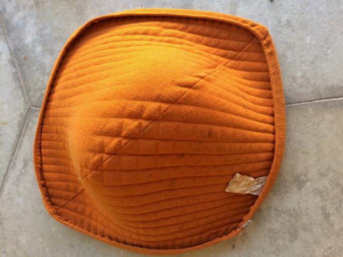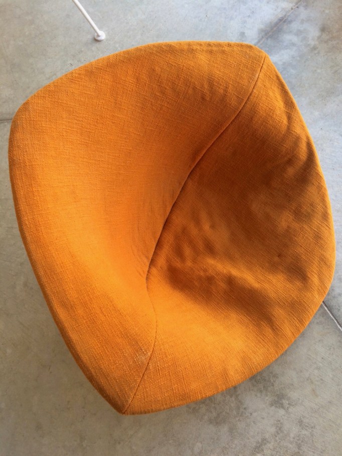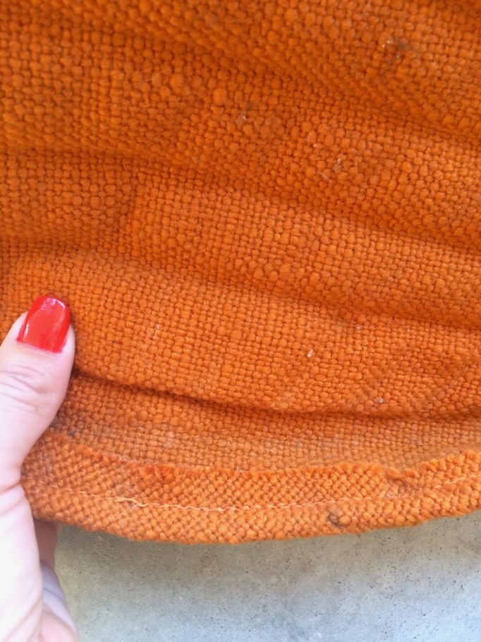 I think it will live right here by the fireplace in our family room (and maybe I will even track down a matching ottoman one of these days?), but I need to address the cover first. The fabric is in stellar vintage condition. No rips or worn spots and only slight fading along the edges. The orange is vibrant and the texture is nubby. BUT. There are some “vintage” cigarette smells and, even worse because I can’t remedy it, the interior foam is deteriorating, leaving lumps and dust. :(