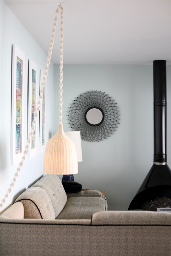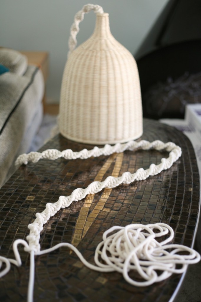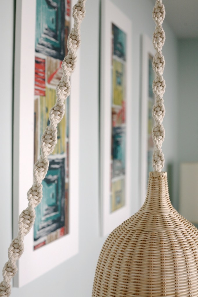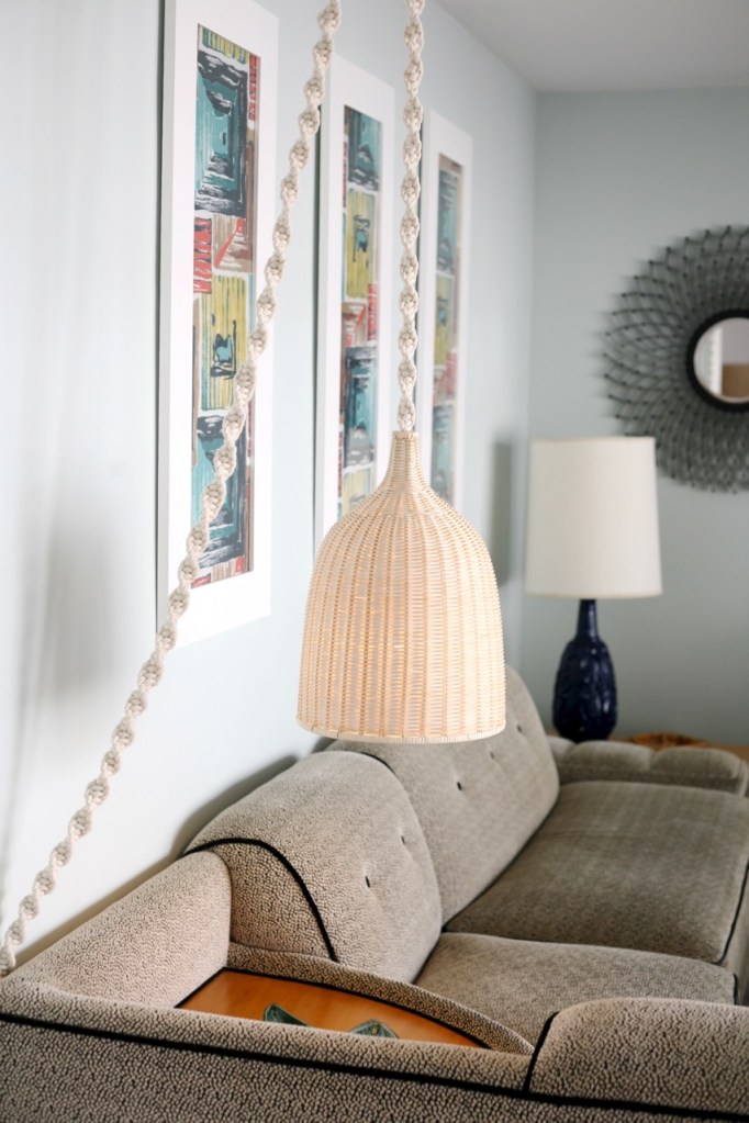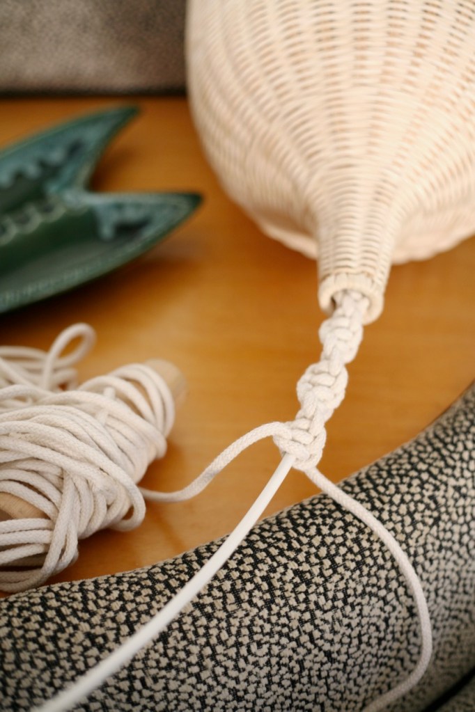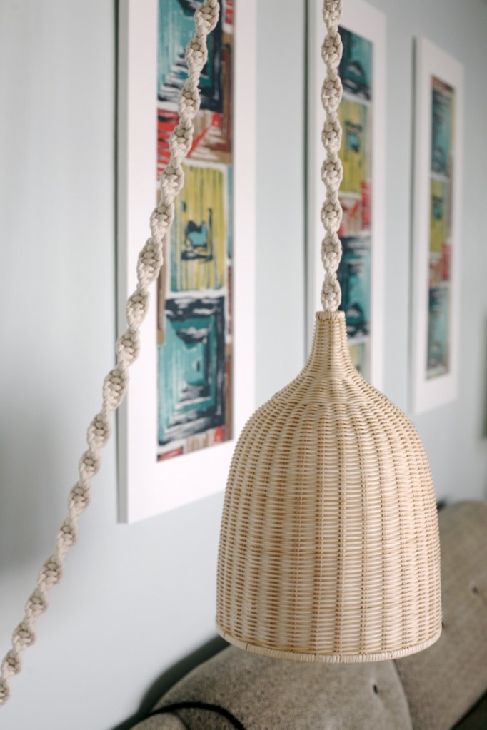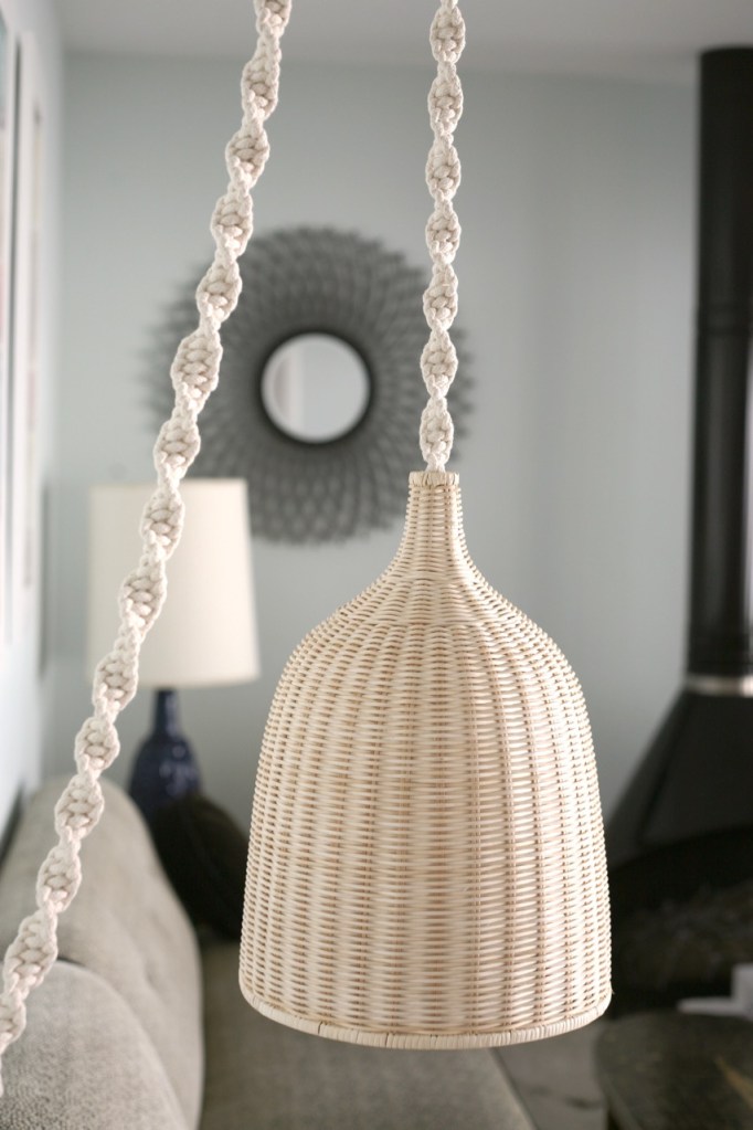 I’m sharing a super simple way to beef up plain or ugly pendant electrical cords today! I have and love this old wicker IKEA lamp, but the plain white cord was an eyesore and I finally, years later, had enough and decided to do something about it. The best solution seemed to be a 100 ft of string plus a bunch of hippie knots in the form of this chunky macrame rope. I am so happy with the little bit of warmth and texture it adds to our den!