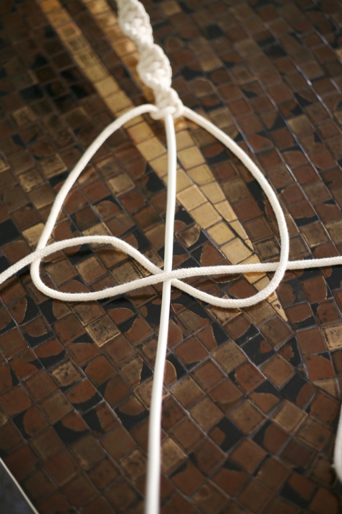 The knot is so easy to make. Use the left string to make a 4 shape over the cord, then take the right string and go over the left strand, under the intersection of the left and middle, and then up through the triangle of the 4.