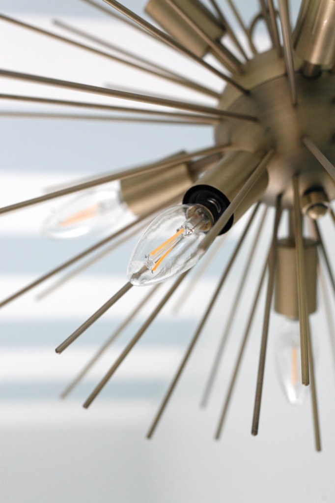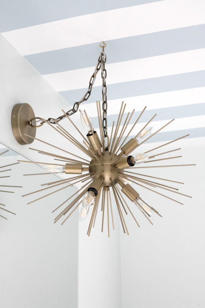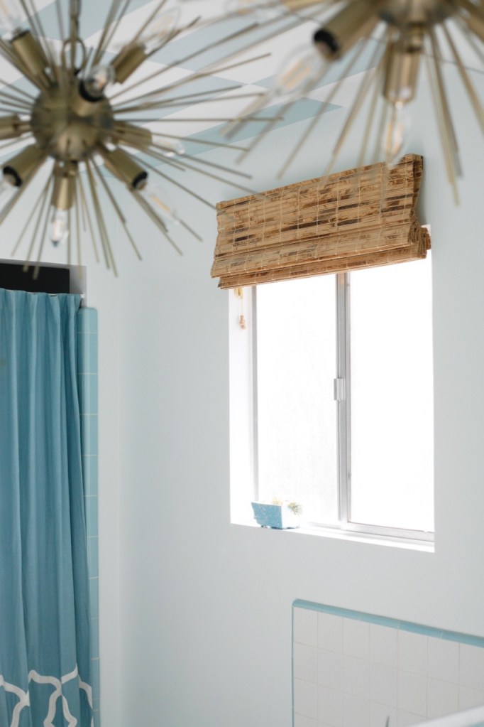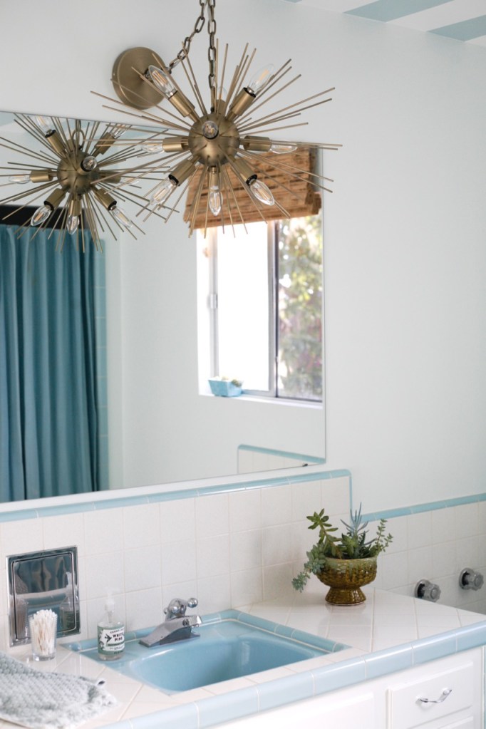 More recently, we tied up some loose ends to get this bathroom finally presentable: drywall repair, baseboards, and LIGHTING! I had always planned on mixing gold in here with the blue, and the gold fleck tiles really amped up that desire. This room is huge. Like could be a small bedroom huge. So the lighting needed to be huge or it would be lost. Also, I really wanted to swag it for some added heft, and to avoid messing with the already wonky electrical in here again. I had my eye on some expensive urchin/sputnik lights when I came across this one at World Market. Now, it’s not as spiky or full as the expensive ones, but for the price it could not be beat (we bought it on major sale too). I was worried about the color being too antique brass, but it’s P E R F E C T. To swag the light, we added a brace across rafters in our attic and screwed a strong hook directly into that. We also swap out the bulbs for these 25w equivalent LED’s because our “vintage” house electrical is stressed with my sputnik addiction.