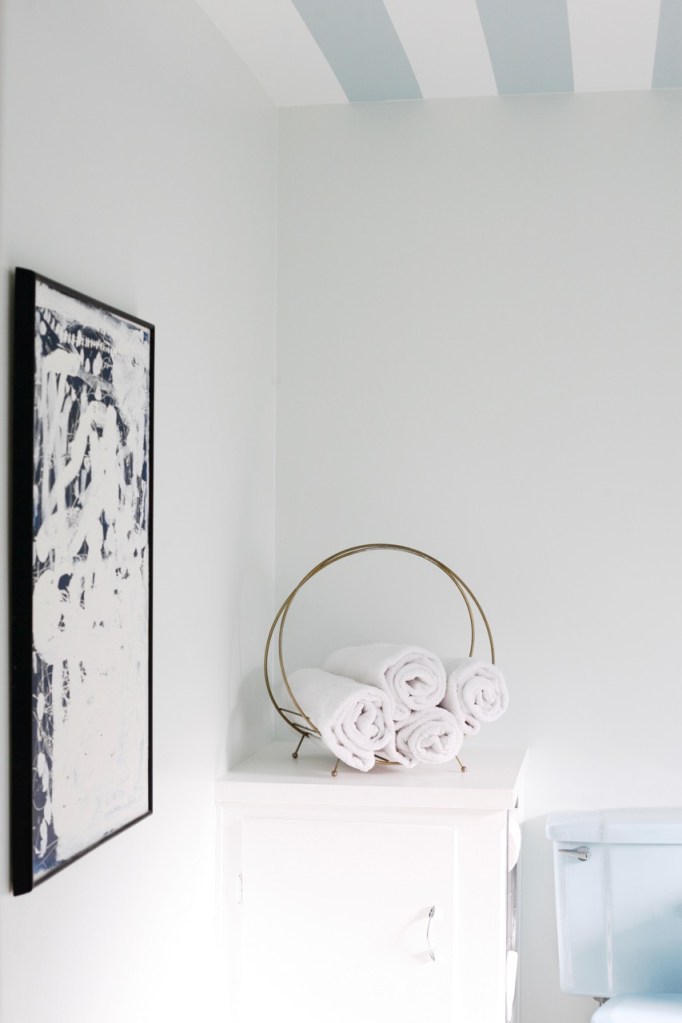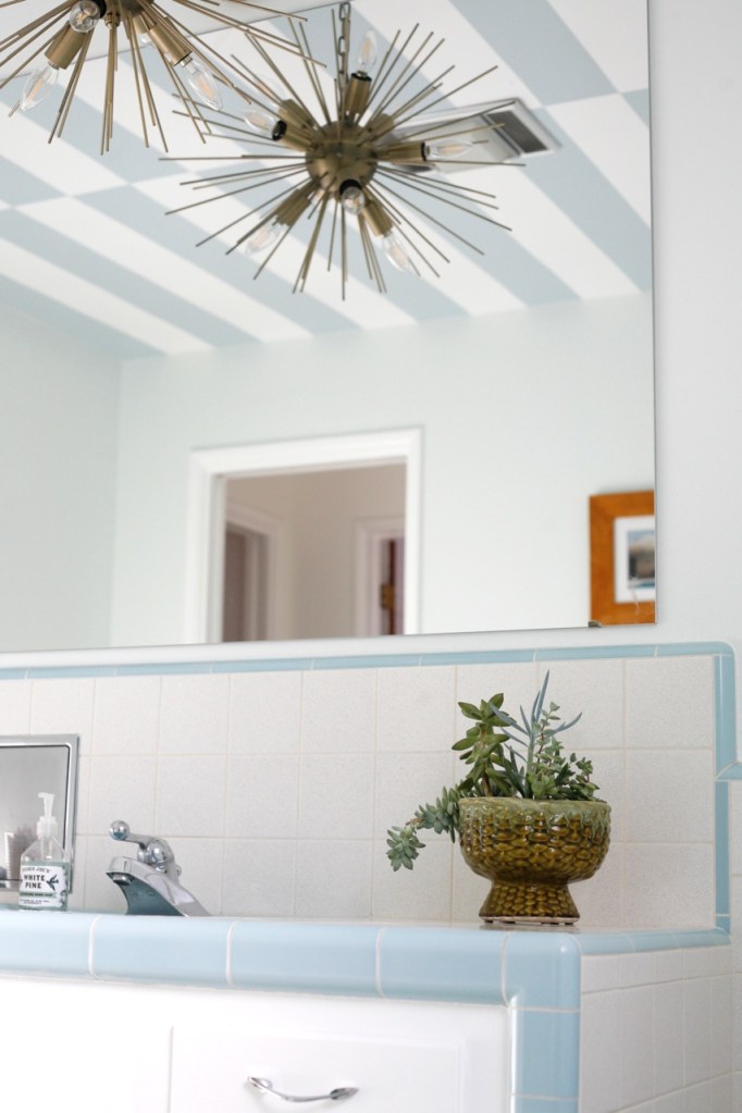 We painted the cabinetry bright white and added vintage chrome hardware. A well-timed stay at the Beverly Hills Avalon, before the recent redecorating, rocked my world…the colors were so similar to what we were working with in our bathroom and I was blown away by the blue and white striped ceiling. I got home and shamelessly copied it.