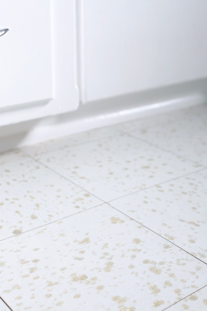 Though we knew original gold fleck baby blue linoleum tile was under the carpet, we thought it was too trashed to salvage. I planned on doing white terrazzo and chose the lightest blue ever for the walls, Behr Lime Light. Little did I know that the original floor was in way better condition that we thought so when we pulled up the carpet after painting we decided to keep it, leaving us with light blue walls and light blue floors. Not a combo I would have willingly chose, but one I loved once I saw it together. The tiles won’t last forever. We work this bathroom and some are beginning to lift from the subfloor. But we’re sticking with them for at least a few more years. (And we found blue with rainbow glitter in our master…sadly badly trashed!)