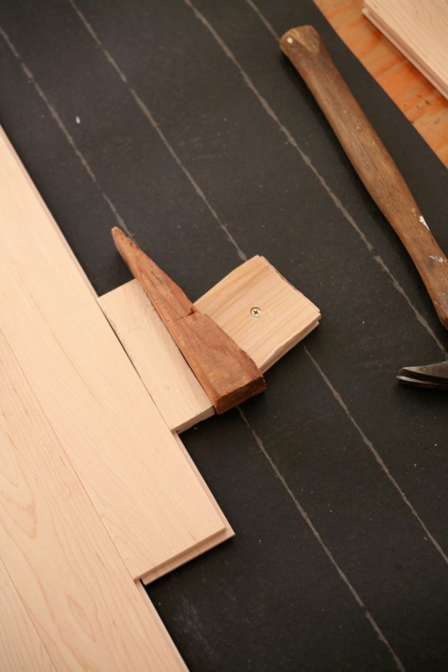 We decided to give our aggravating hardwood floor install another go and we’re SO glad we did!!! We upgraded up our flooring product (unintentionally – an ordering mistake on our part whoops) and the (unintentional) payout was HUGE. Last time around we used Bellawood’s solid 3/4 x 3 1/4″ Natural Maple, so beautiful but a nightmare to install, and this time bought the Select Maple. It was worlds better in quality – straighter, less milling imperfections, easy to install, and almost no trash boards. A wood flooring success for once in our lives!