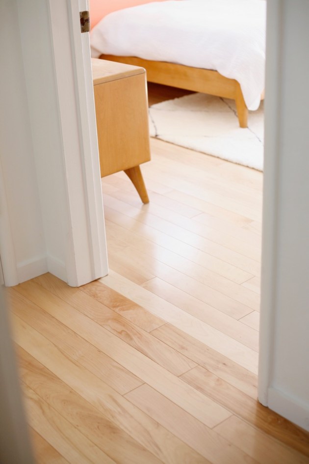 As expected, the new wood currently contrasts starkly with the aged, yellowed older stuff, emphasized by the extra pale (but oh so straight) board we decided to start with in this room. It looks intense right now, but it will mellow out over a few months. I’m not worried, though it’s always so interesting to see side by side and something to take note of when you are thinking of purchasing prefinished wood flooring: the finish will darken and yellow in time!