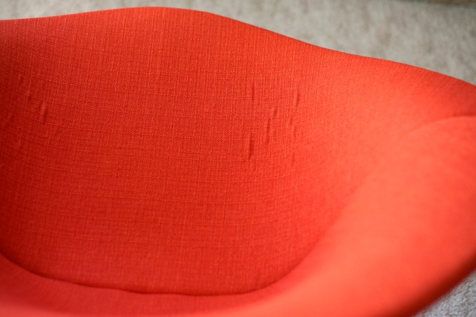 My biggest worry was that the fabric would be cheap looking and in an off color. I picked a vivid red-orange from their fabric choices (Persimmon) and, while not as nubby or as thick as my adorable original, it has some texture and is better than expected. The color is surprisingly great! The foam itself is thinner, which I’m fine with, but it arrived with a few areas where the foam isn’t totally adhered to the fabric causing bubbling. Not ideal, but you only see it in certain lights and it’s not a deal breaker for my lazy butt.