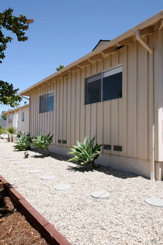 Then I spent a good six months slowly finding plants, planting them, and moving them around until it felt right. I tried to work in a few existing plants in an effort to save money and labor (you can kind of see my attempts to integrate them in this post), but in the end it wasn’t worth the effort. We ended up keeping nothing besides two crepe myrtle trees on the slope, our huge beloved dragon tree in one corner, and our huge palm tree in another. It was scary to have such a huge blank canvas to fill up with plants and money, but once we actually got rid of things we didn’t like, it made it much easier to design a landscape that we truly love, that we are able and willing to take care of, that better goes with the look we are going for, and that fits into our low maintenance/low water needs. More about plant selection and specifics way down at the end.