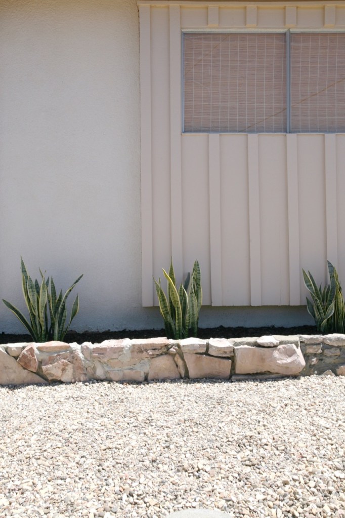 Some of our plant budget was literally thrown away on plant fails. I really wanted purple cordylines to line our rock bed, but no matter what I did, I couldn’t keep them alive. I threw close to $200 at them, they all kept dying, and I finally had to thrown in the towel and change course. Plants that continually die on you are not zero maintenance. My next attempt was Mexican fence post cacti but acquiring them here proved near impossible. Next experiment, San Pedro cacti, also failed: cactus sunburn. Luckily, I only attempted this on a small scale, mostly due to plant scarcity, and was able to move the burnt guys to the back. Going back to the drawing board for the 4th time led me to try Sansevieria, something I only considered a shade plant because they THRIVE indoors, but can actually tolerate sun. They are doing great! Only took 4 tries.