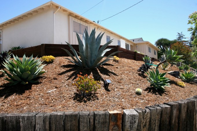 The great thing about agaves, attenuatas in particular, is their ability to multiply. You cut off the pups, the bonus agaves that grow from the mother plant, plop them in the ground and they grow! So easy. In a few years I anticipate the slope to be lush and full, but still minimal. But a note about agave americanas, pictured below. They also pup and multiply but they are sharp and their sap is a skin irritant. If you let them clump, you can have an unmanageable mess on your hands. My proactive approach has been to treat pups like weeds…when I come across them while weeding, I pull them out (easy when they are little) and toss them to keep things nice and ordered.