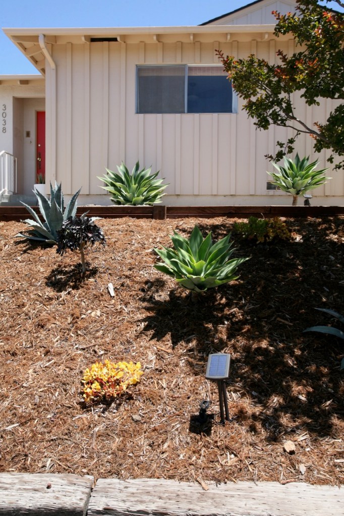 Our slope was very much inspired by the slope landscaping at Fletcher Cove in Solana Beach, CA. I fell in love with it last Spring when we were there because it is very colorful and graphic, simple but interesting, and lush feeling without water requirements. Our climate is similar so I knew it could work. The slope is where the bulk of our planting happened and is basically a repeat of agave attenuatas, blue agave americanas, black aeoiums, yellow jades, and golden barrel cacti.