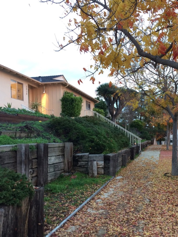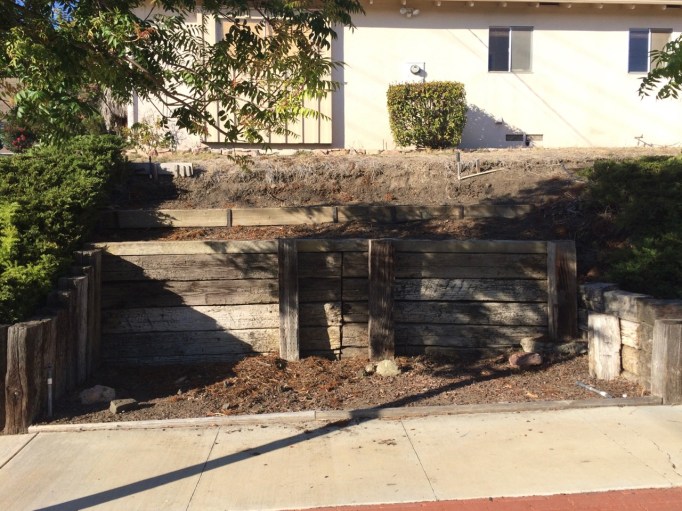 Our slope was very much inspired by the slope landscaping at Fletcher Cove in Solana Beach, CA. I fell in love with it last Spring when we were there because it is very colorful and graphic, simple but interesting, and lush feeling without water requirements. Our climate is similar so I knew it could work. The slope is where the bulk of our planting happened and is basically a repeat of agave attenuatas, blue agave americanas, black aeoiums, yellow jades, and golden barrel cacti.