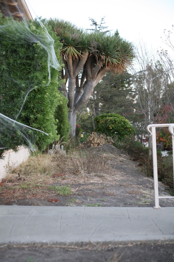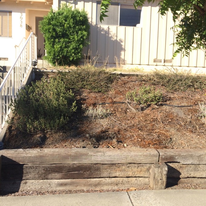 A brief history: Our front yard came to us with a patch of thirsty grass with a crumbling and steep drop off and an assortment of random flowers and bushes. We stopped watering everything when we moved in and let it go for a few years while inside projects demanded attention, turning the yard into a ratty weed/dirt patch (sorry neighbors!). This is on a very good day after rains turned weeds green: