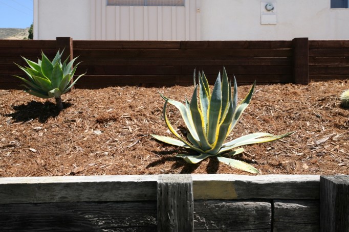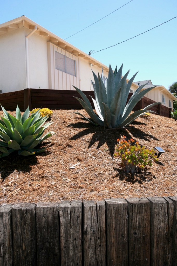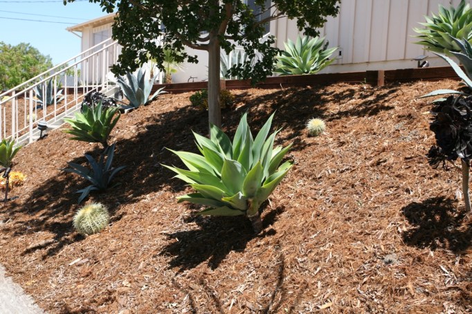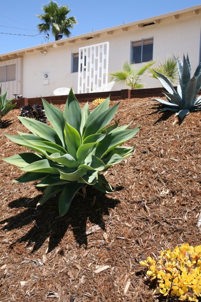 The great thing about agaves, attenuatas in particular, is their ability to multiply. You cut off the pups, the bonus agaves that grow from the mother plant, plop them in the ground and they grow! So easy. In a few years I anticipate the slope to be lush and full, but still minimal. But a note about agave americanas, pictured below. They also pup and multiply but they are sharp and their sap is a skin irritant. If you let them clump, you can have an unmanageable mess on your hands. My proactive approach has been to treat pups like weeds…when I come across them while weeding, I pull them out (easy when they are little) and toss them to keep things nice and ordered.
