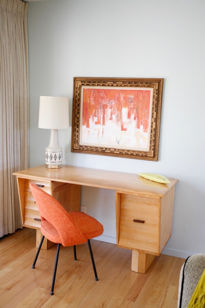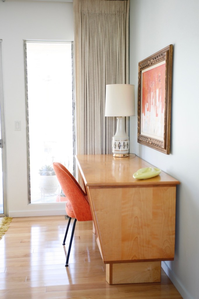 Not too long ago, we moved out the bookshelf (which I LOVED in here so much ouch) and made way for a desk to give my husband a dedicated and quieter space on days he works from home, which has provided us with slightly more purpose in here. And a much needed pop of orange. We call this room the den, but it’s really our extra space where we would cut square footage if we could. Not that it’s a bad space at all. It opens up to the backyard with big sliding doors and offers great light and is, currently, wonderfully weird. We just aren’t exactly sure how the room can serve us best. We have considered making this the dining room (which creates more problems – what to do with our current one) or opening it up to the kitchen, but neither are compelling enough to act on. Maybe when our kids reach teenage years we will be thankful for the additional living space, but our living room turned family room is our main hang place, so for now this room is confusing. At least it is cute and cheerful while being confusing!