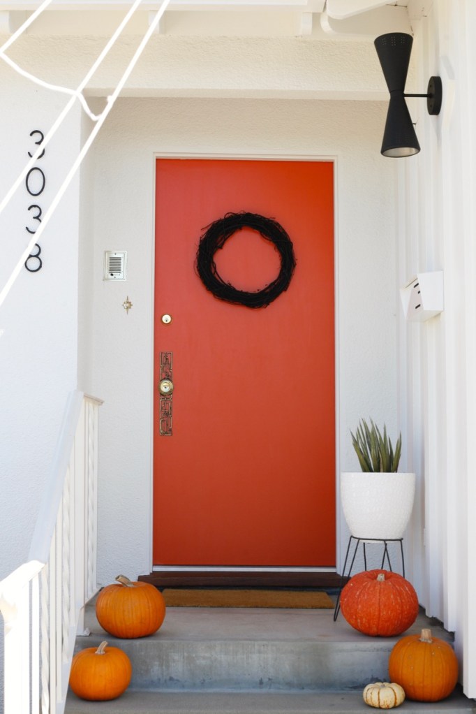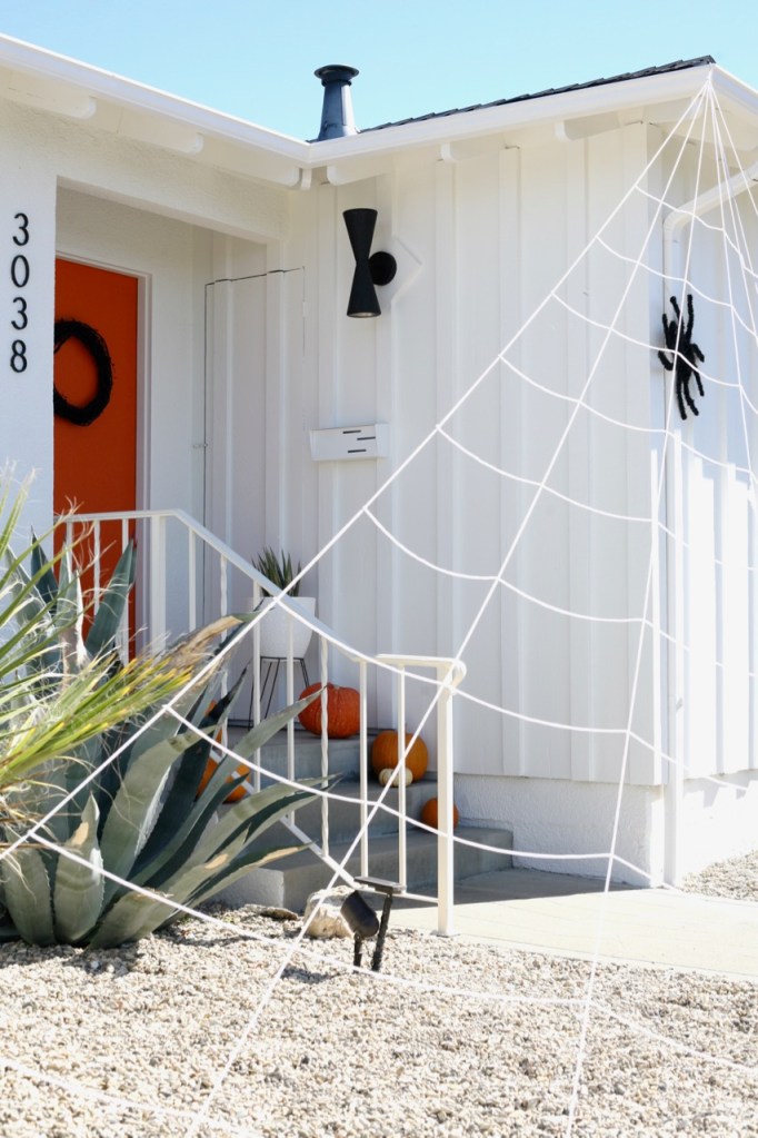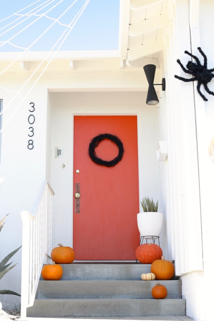 Starting out front with the new white paint and new black fixtures and the new-to-Halloween orange door!!! LOVE LOVE LOVE. This was the year for exterior transformations and dang have we come a long way since our tan and turquoise 2017 Halloween.