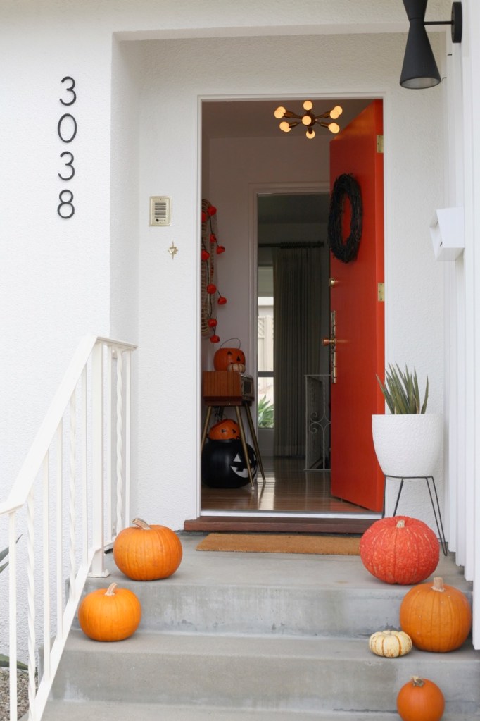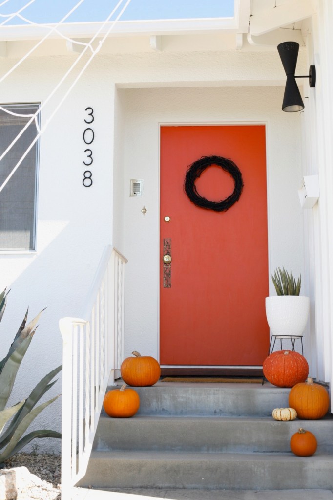 Starting out front with the new white paint and new black fixtures and the new-to-Halloween orange door!!! LOVE LOVE LOVE. This was the year for exterior transformations and dang have we come a long way since our tan and turquoise 2017 Halloween.