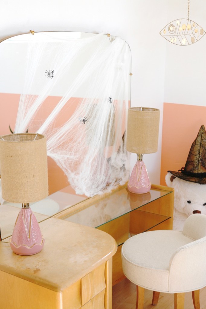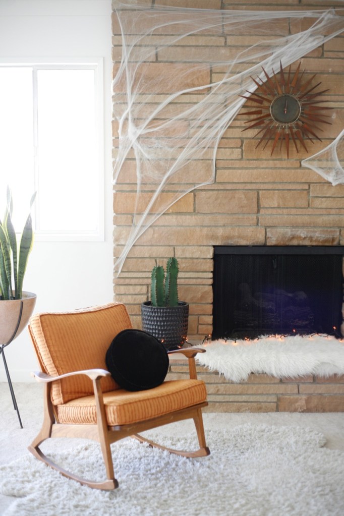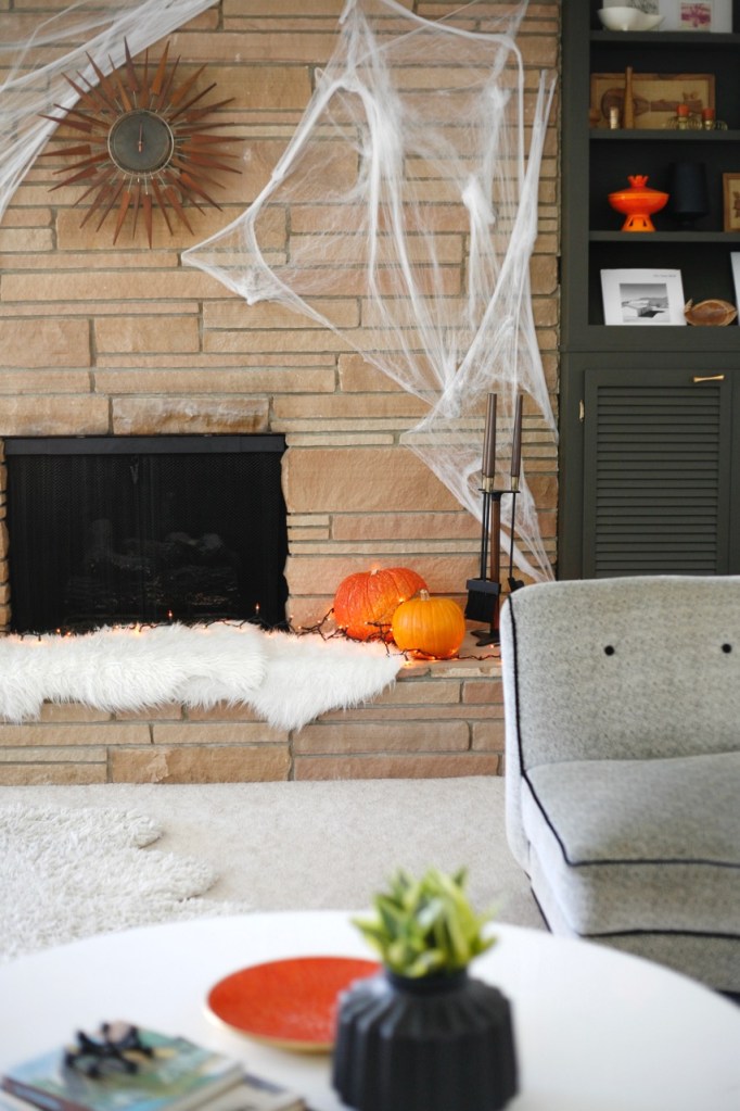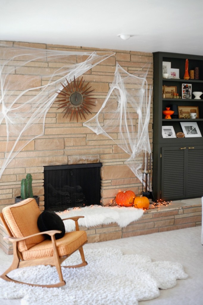 Spider webs are becoming my favorite Halloween addition. Big impact with minimal storage. (Do you notice the couch swap I am experimenting with? The colors are working.)