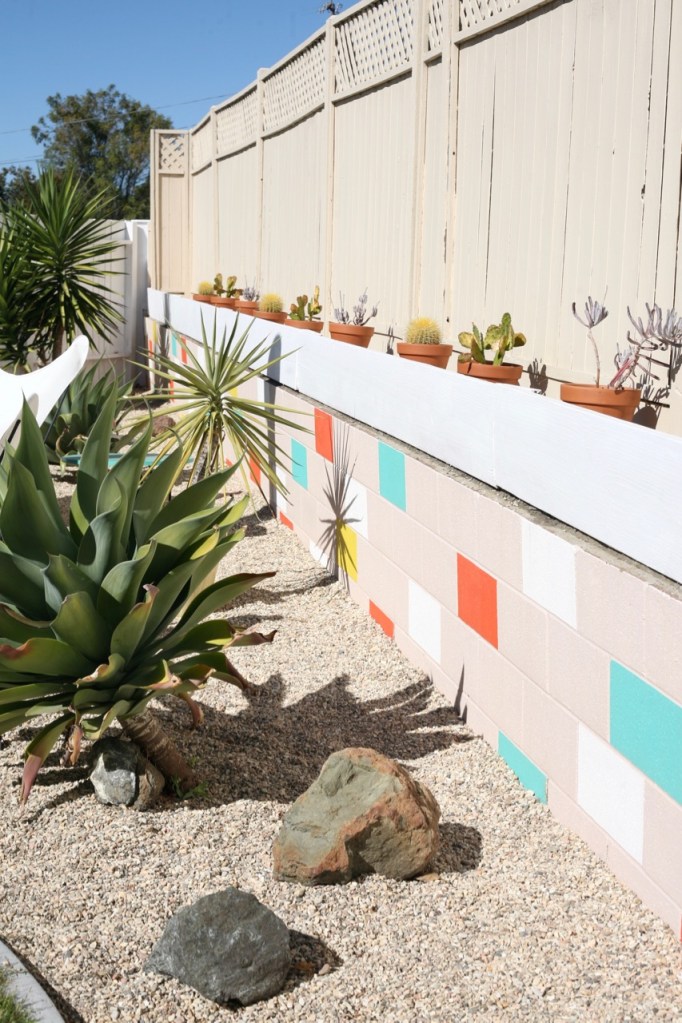 Privacy plants might be the easiest and cheapest solution, but those require maintenance and water and take up space – not ideal. I’m thinking about a wall topper/extention, where you screw “posts” directly into the side of the cinderblock and build up from there but I’m not sure if 6′ of height is feasible. I decided to go ahead and begin painting the mosaic wall white where the tan is while we think more about this one. Ideas welcome because we are stumped!!!