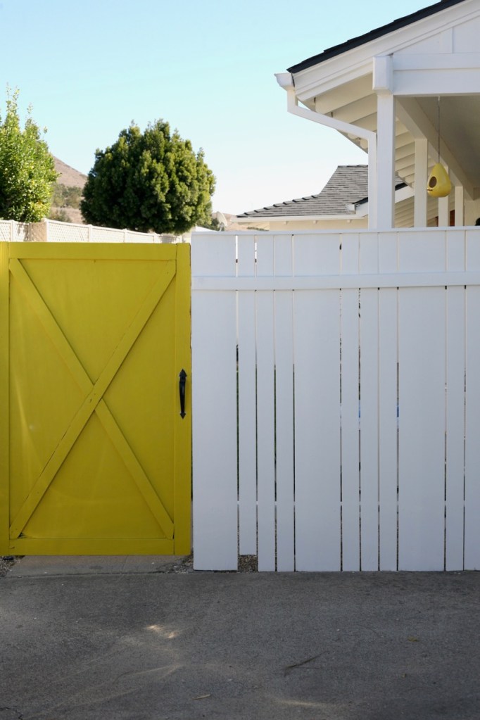 We desperately need to build a new back gate after wind storms trashed this flimsy one. I wondered if yellow would be fun so I took the opportunity to try it out on the junk gate before we dismantle it, slapping on a coat of the same color I used on our kitchen pocket door. I didn’t love it at first and thought it was too much with our orange door, but now it has grown on me so much and I can’t imagine any other color. Put me down for multiple crazy colored doors please.