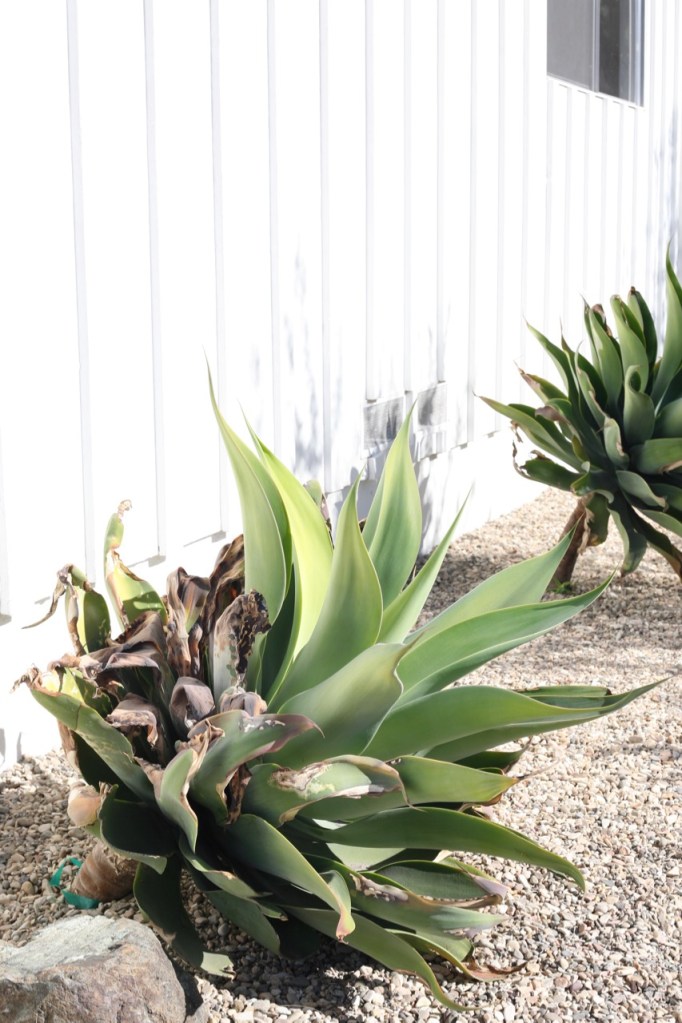 Oh and I forgot the other thing I need to deal with. The painting inadvertently trashed some of our plants. Agaves are generally ok with abuse. Don’t water them. Dig them up and leave bare roots out in the sun for a month. NO PROBLEM. But dare cover them up with something like a drop cloth for even one day, and they will revenge rot/die on you. Our beautiful agaves by the front door took the brunt of it. And the sansevieria experiments in the rock bed above that were barely hanging on before the dropcloths are pathetic now.