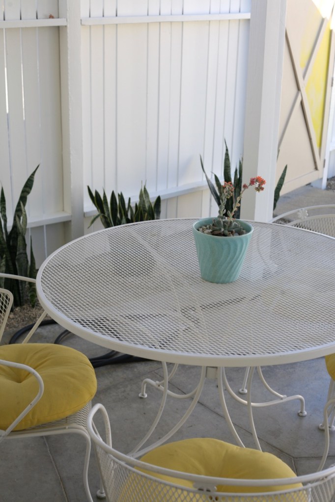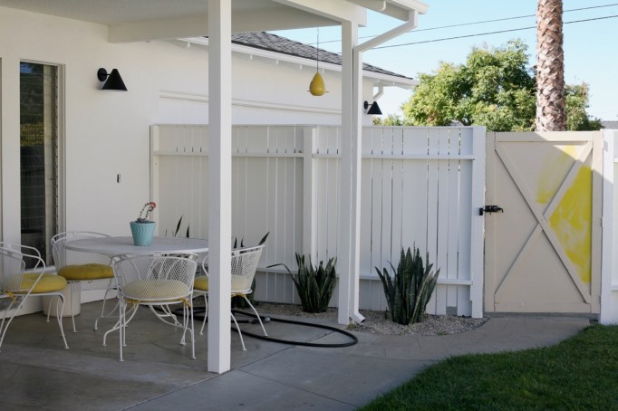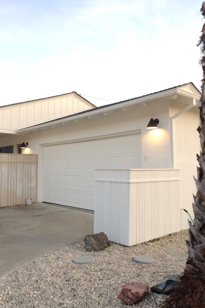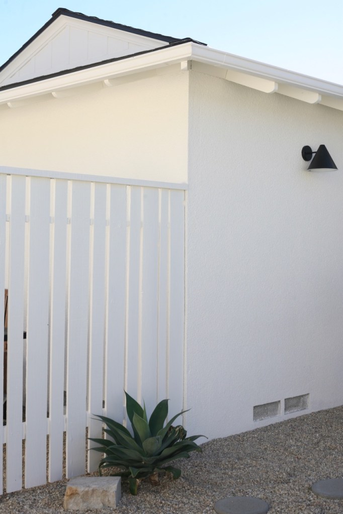I started with our “trash fence,” the one that hides trash cans, and the long curved fence that separates our driveway from our backyard (we have a weird corner lot). After loving the high contrast of our new exterior lights (more cute lights here), I toyed with idea of painting the fences black, ultimately deciding that I love a sun-drenched view of the backyard from inside the house. Went with white. Needed 3 freaking coats and I’m almost done but not quite. And of course I discovered a termite infestation and rotting boards and the whole fence should be replaced ASAP but who has the time or money? For some reason every fence post on our property, besides 3, was put into the ground with no concrete footing = a never-ending buffet for termites. WHY WHY WHY