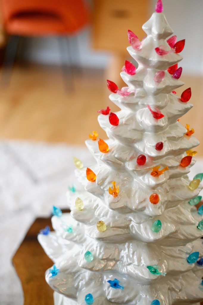 Did you have one of these ceramic lighted trees as a kid? We did and it might be my favorite Christmas decoration memory from childhood. (Well that and an odd stuffed Christmas mouse in clothes that hid under low slung furniture? Mom???) I looked forward to organizing those little plastic bulbs all year long! It was the Lite-Brite, another childhood OBSESSION, of holiday decor. Of course, I wanted my kids to have the same exact experience (parents are so weird) so I found one of these vintage Atlantic Mold trees when they were babies and now my kids look forward to popping in the colorful pegs every year too. Weird mission accomplished.