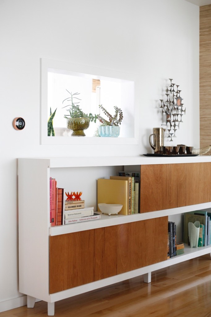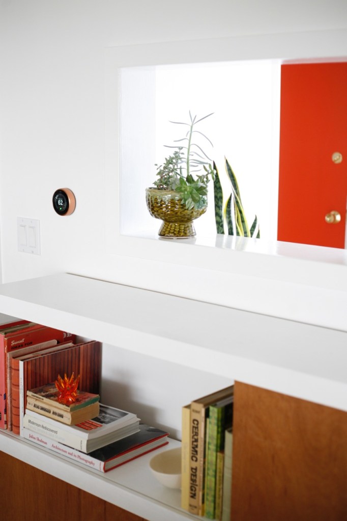 I love looking at your blog. I just put a polished steel Nest in my Ranch yesterday. Love it! I was intrigued by the little orange glass flower things on your bookshelf. Are they candlestick holders? Love the bookshelf too, did your husband make that? Thanks, Laura