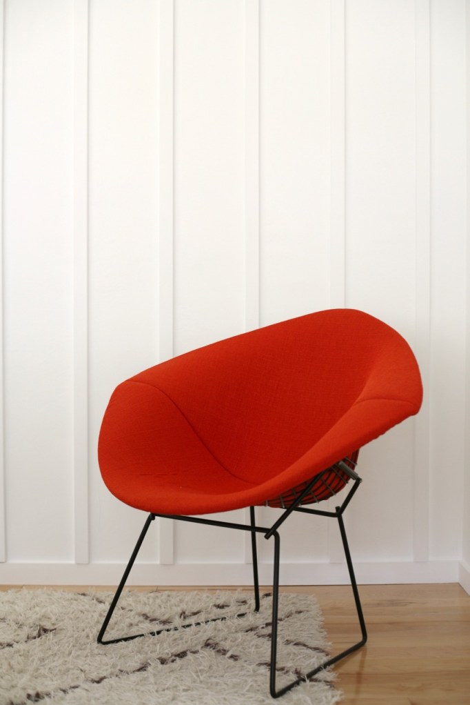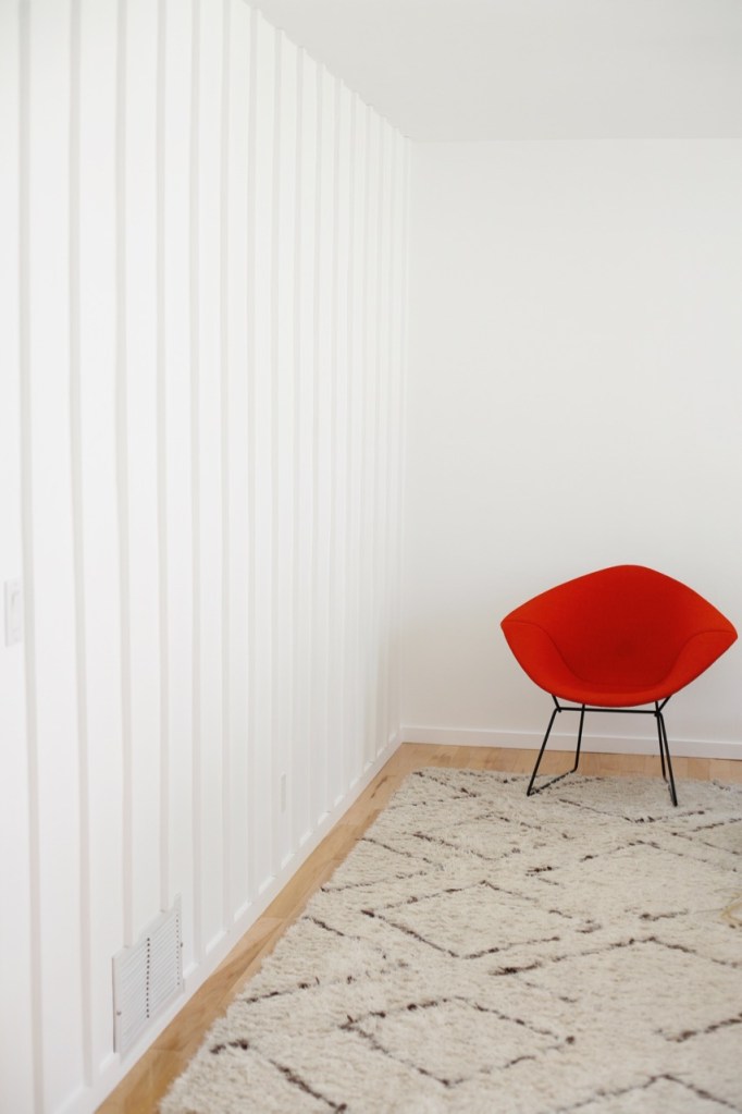 But let’s start from the beginning. In an effort to keep the bright white walls from looking sterile and boring, I wanted to add some texture in the form of paneling. Let me sing the praises of surface irregularity on walls: it adds interest without adding physical stuff or clutter. I’ve been knocking around ideas for months, finding this post especially helpful. I kept coming back to clean, minimal, narrow, vertical paneling. Something that could be original to our 1961 ranch house and would mimic the exterior (excuse the Halloween post…I really need to photograph our new exterior paint and this is all I got right now ha!). Something like: