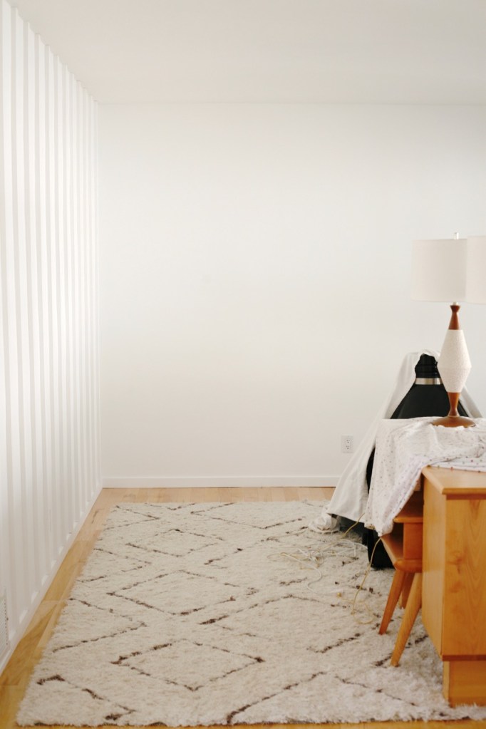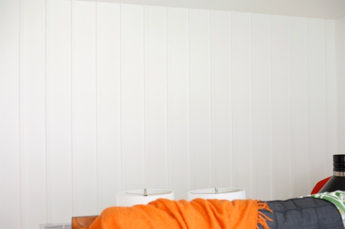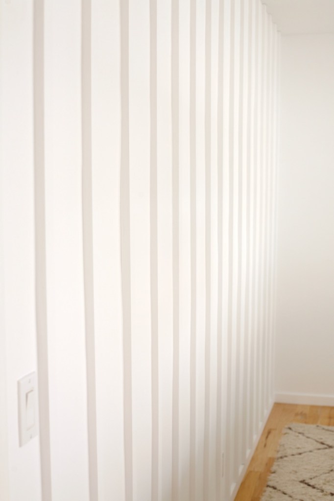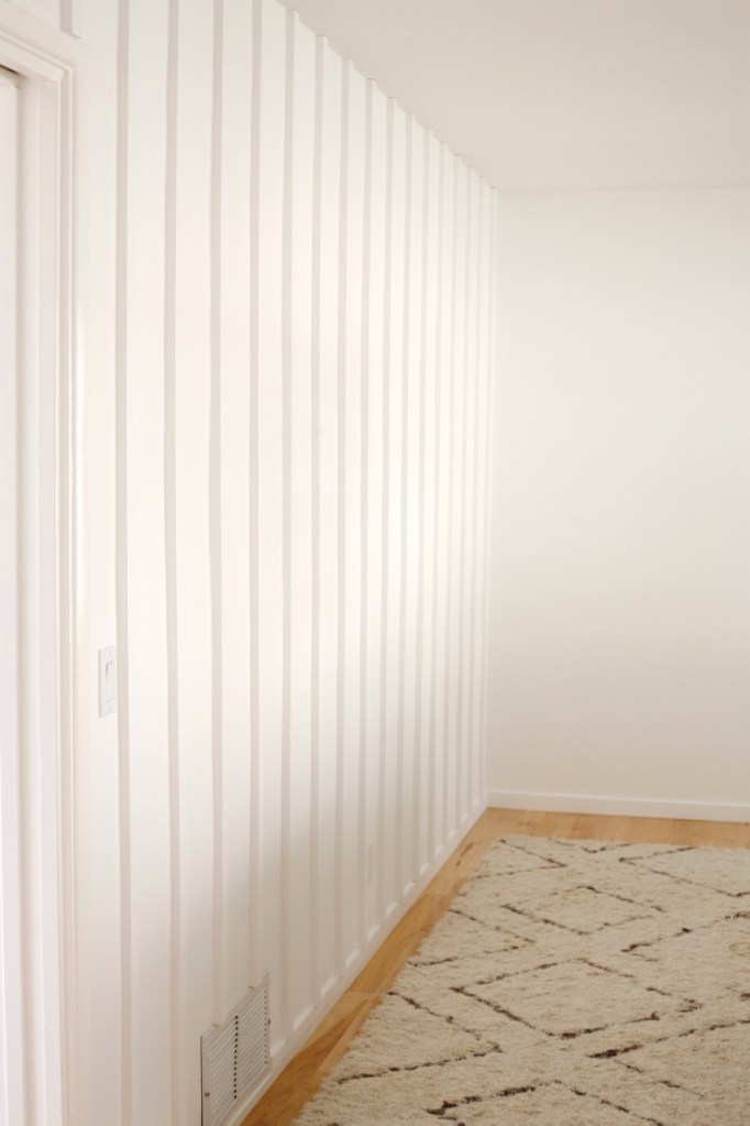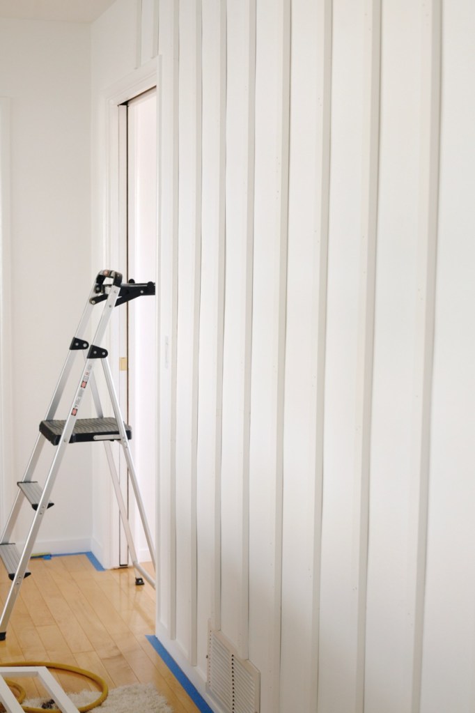 One thing to note, I was careful to keep the details extremely simple to avoid any farmhouse feels with this project because it had the potential to go real country real fast. The key to keeping it modern and true to the era of my house, I believe, is narrower boards, close spacing, taking the boards all the way to the ceiling, and letting them overhang our baseboard. (Taking them all the way to the floor would be even better, but unfortunately not an option for us.)