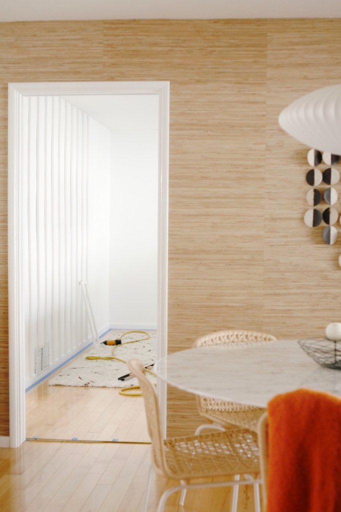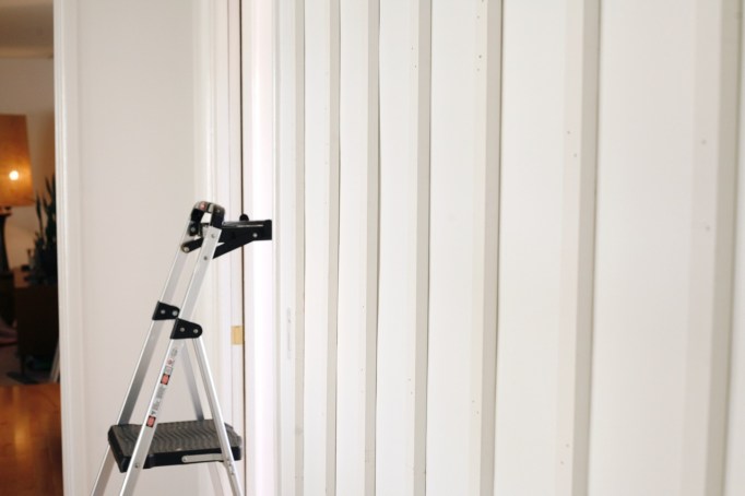 But we quickly hit a literal bump. As we started hanging the (straight) boards, it became immediately apparent how wavy our walls are, creating major gaps between the boards and the wall. What we thought would be a 5 nail/board situation was turning into a 30 nails/board situation, and that still couldn’t close the gaps. Visually, things were not pretty. My do-it-right husband was frustrated with the ratty do-it-yourselfer vibe. While I was confident that caulking would conceal the uneven wall that the faux battens were emphasizing, I was honestly happy enough with the dramatic improvement brought by the white paint alone to not push this one. So we talked about abandoning ship.