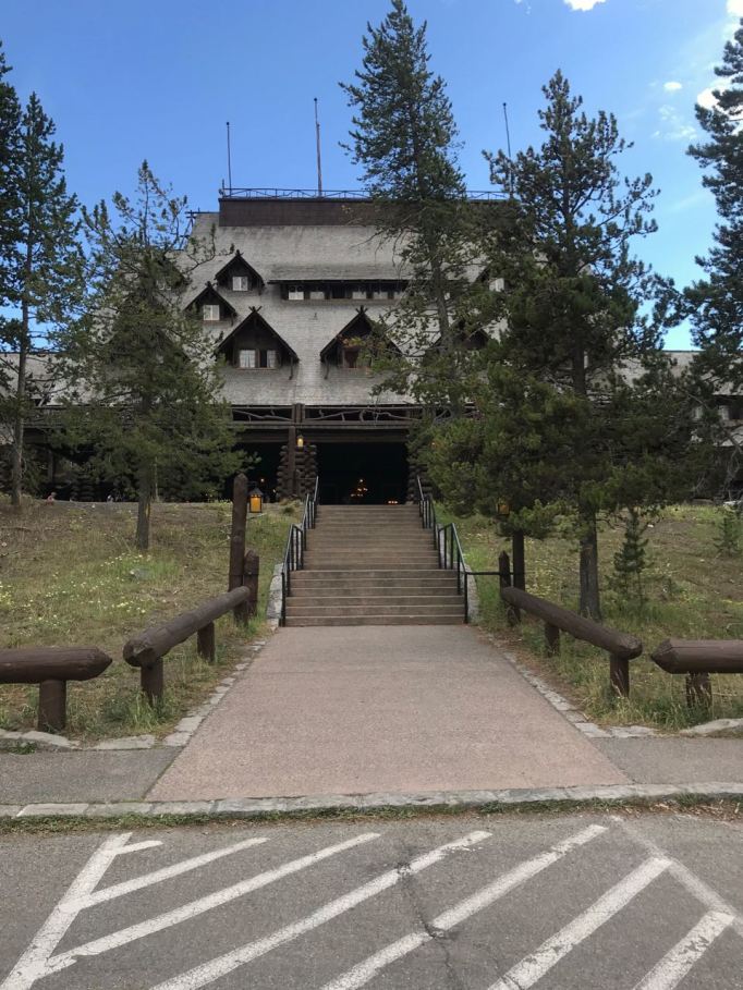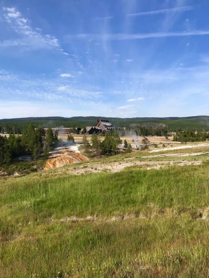 Canyon Village Lodging: This was our first time staying in the Canyon Village area because often online forums will say how crowded it is, but we loved the central location and the quirky mid century at summer camp vibe! We got a Western Cabin at the Canyon Lodge & Cabins. The cabin architecture is funky in the best way and, while the interiors are stripped of retro character, they are a nice place to spend a night. The nearby main building, housing various restaurants and shops, is mid century National Park architecture at it’s best. Even the interior is designed with the original architecture in mind. Bonus of staying here was being able to drive back down to Hayden Valley after dinner to animal peep during primetime – which we all agree was our favorite activity of all in the park! Day two itinerary: I would have stayed our second night at the Mammoth Hot Springs Hotel but it was undergoing renovations during our trip and I was more than happy to do two nights at my ultimate destination, Old Faithful Inn, and have to backtrack a bit one of the days. So for us, our day 2 was spent covering the upper loop area between Canyon and Mammoth, including Lamar Valley. This is the day we saw the grizzlies right after we got on the road oh my goodness!!!! We ended with an afternoon hike to an lesser known river/hot springs spot right on the Montana state line (but the springs were extremely hot and the river was fast so I don’t recommend it for younger kids). Then we drove straight to the Old Faithful Inn and spent the rest of the night soaking up Old Faithful Inn. More on that in a second.