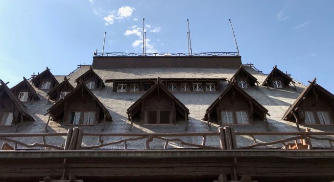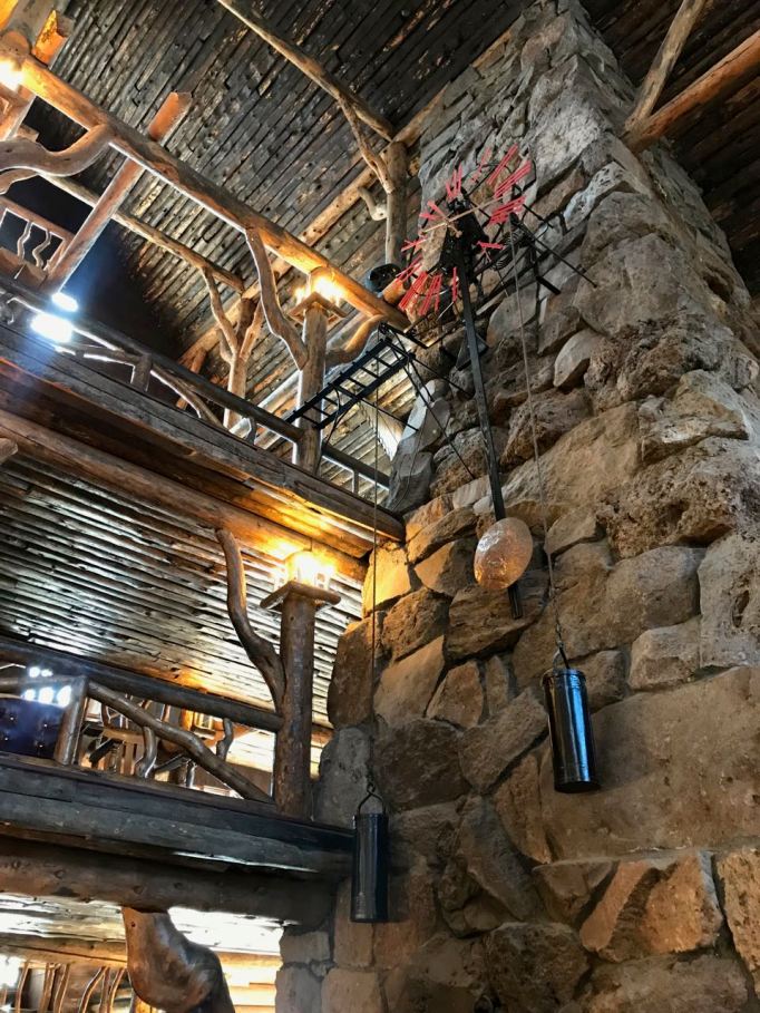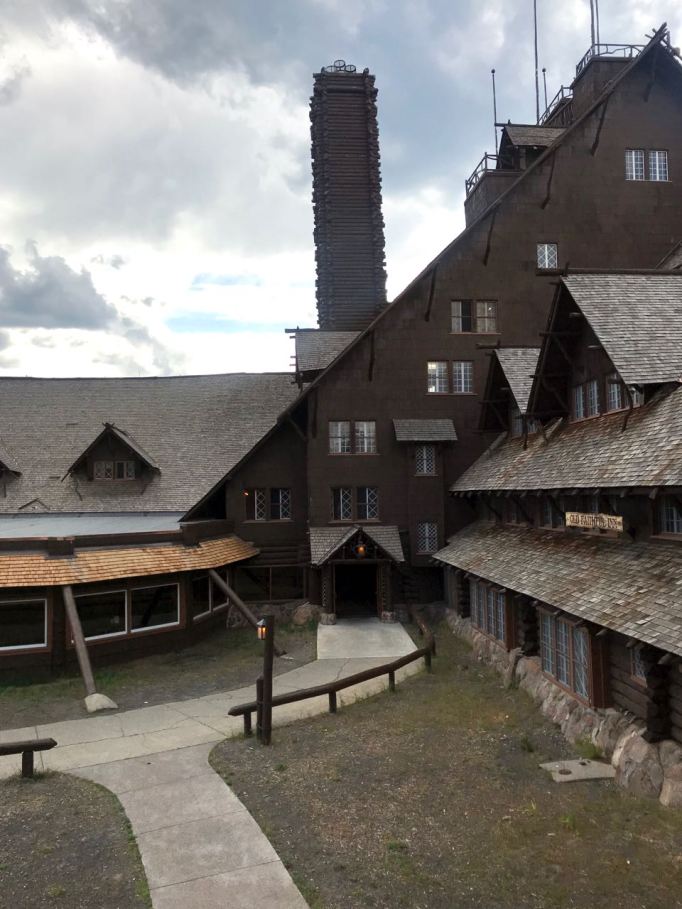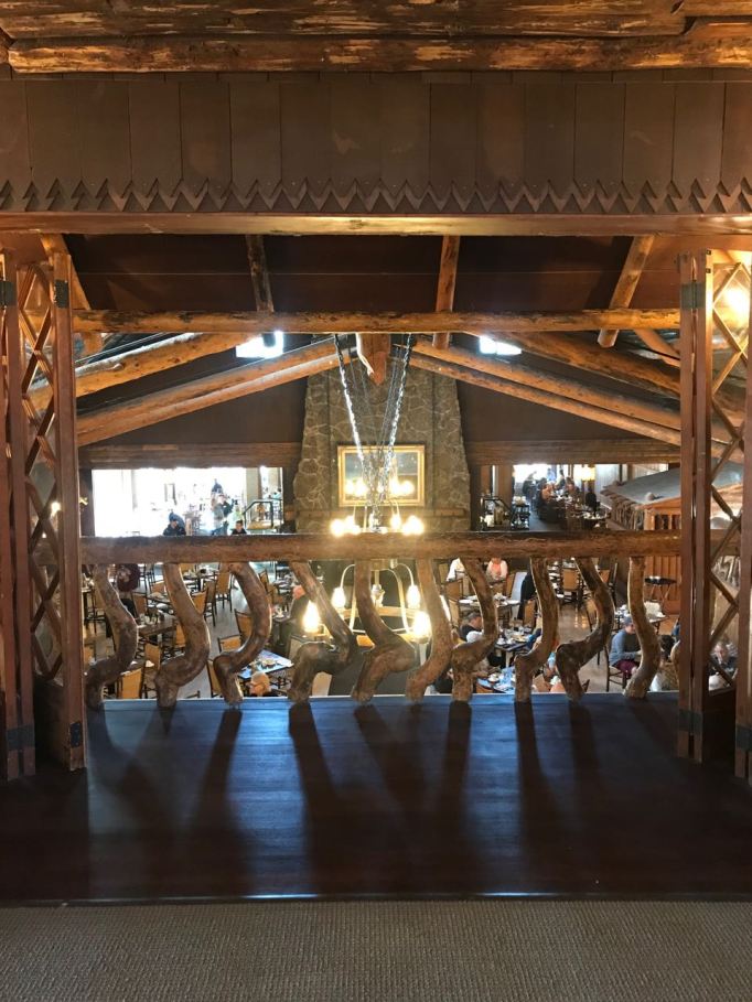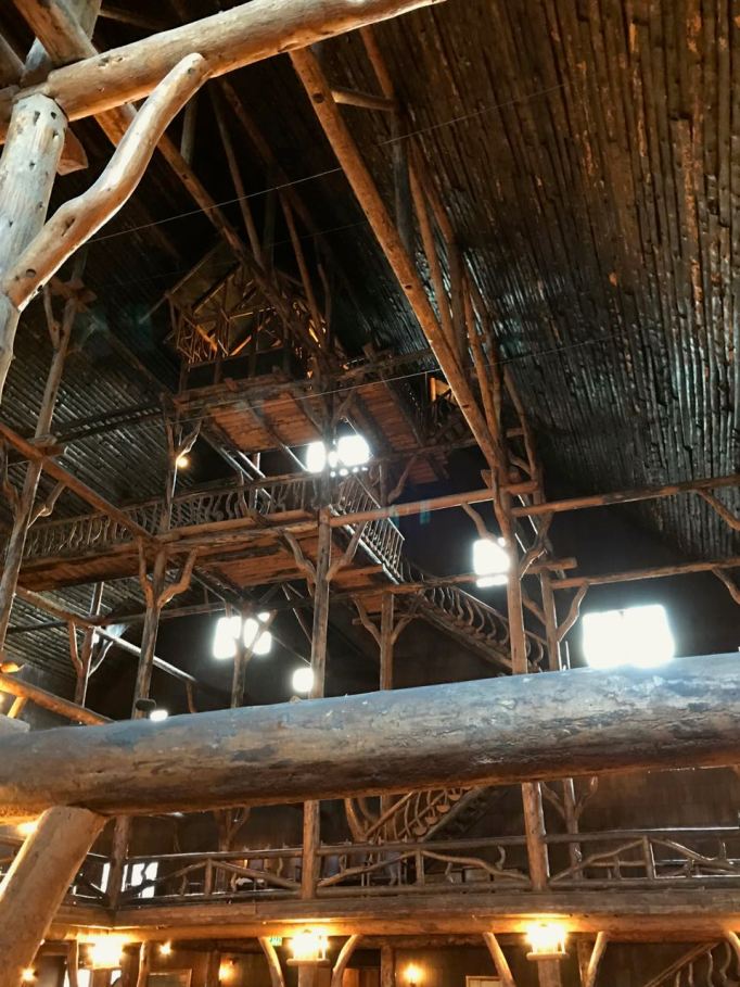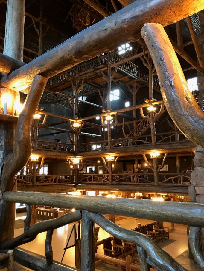 Old Faithful Inn: Old Faithful Inn is the largest log cabin structure in the world and inspiration for countless other lodges, National Park related and not. It was built 1903-4 by a crew of 50 men who WORKED THROUGH THE WINTER to complete it. This is unfathomable to me considering the sheer size of the structure; it’s hard to even convey the cavernous height in a photo. The lobby is truly stunning and massive, built as tall as the lodgepole pine forest from where its materials came, complete with an indoor tree house at the very top (closed to visitors – fire codes). One person’s job was literally to find the “freaks” of the forest to use on the railing detail and throughout the lodge for interest. The architect, who was only 29 years old when he got the job, insisted on imbalance and imperfection to mirror nature. We booked a room in the “Old House”, the original part of the lodge. Most of these historic rooms do not have their own bathroom, though they do have a sink. There are nice shared bathrooms on each floor of each wing so it was fine. I would gladly trade not having an in-room bathroom to be able to stay in such a special building. Nights after tourists left (and early mornings too) were magical. Guests gather in the dimly lit lobby, reading, playing cards and watching lighting storms roll in from the deck. Words cannot describe. We ate in the dining room one night and our kids parked themselves for the entire evening at one of the cute little secretary desks placed around the upper levels of the lobby, drawing comics. The next night we did a twilight walk through the nearby geysers and spent hours playing Uno surrounded by logs. Our time in the Inn was truly amazing and a dream come true for me. Stay there!!! And take one of the architectural tours!!! My cell phone pictures obviously cannot begin to do this magnificent structure justice.