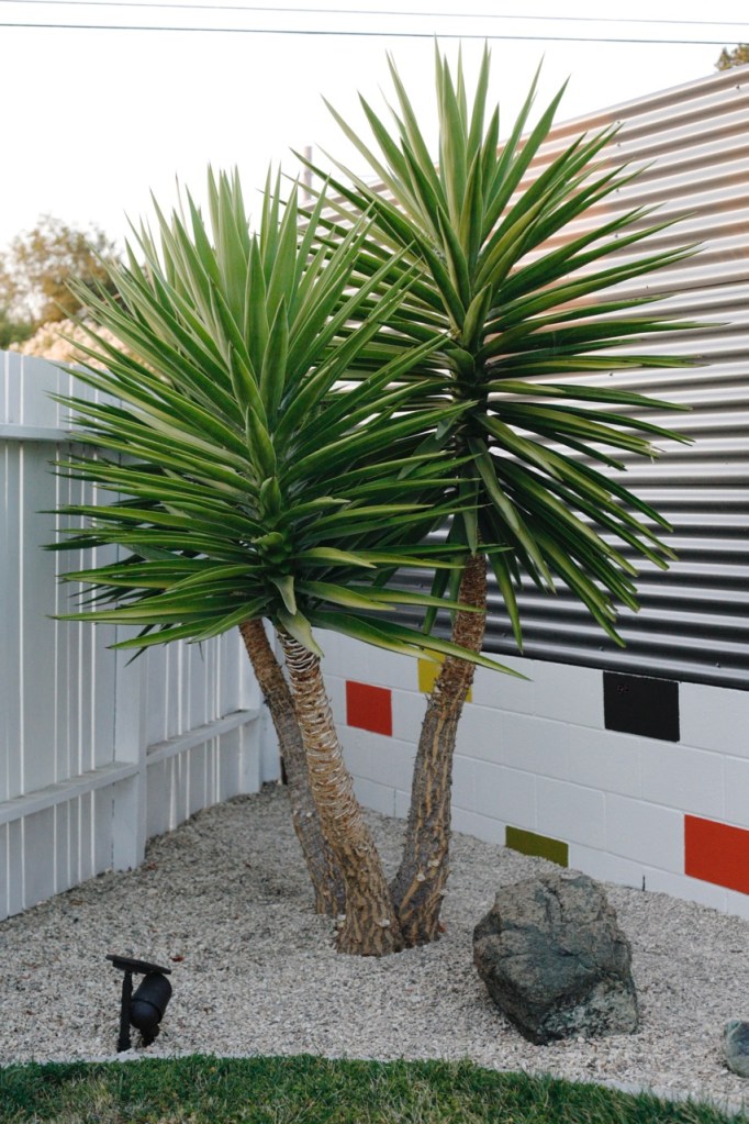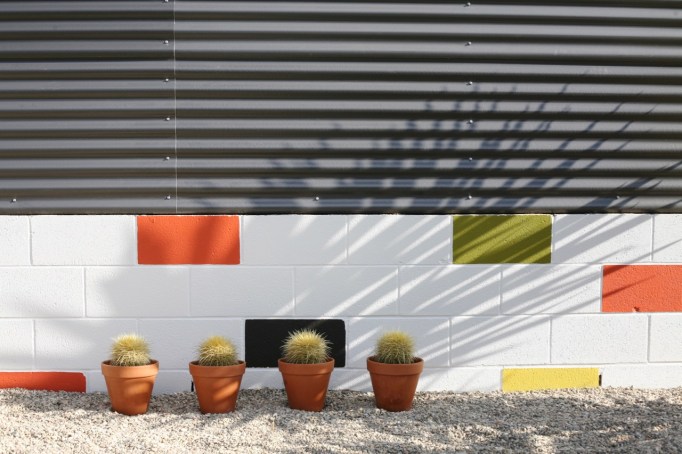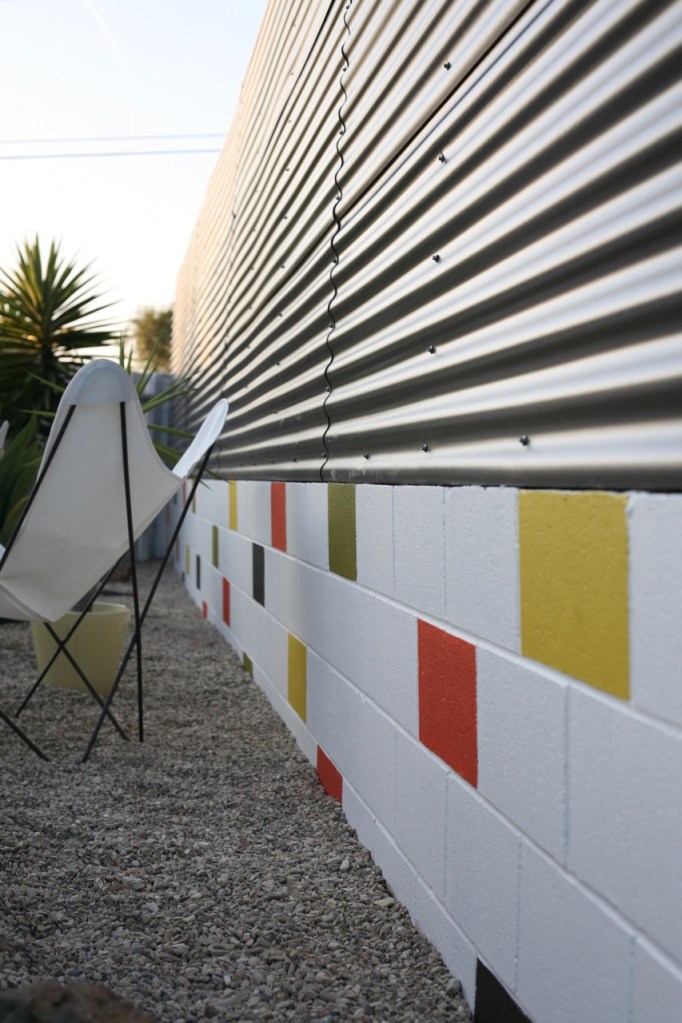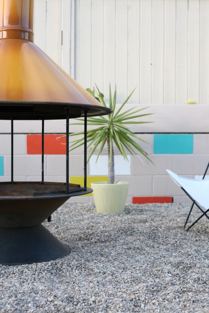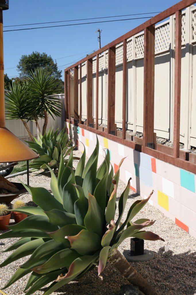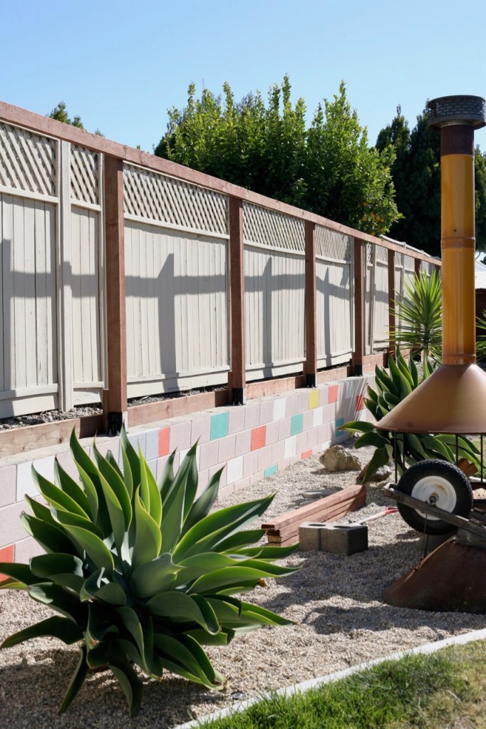 Probably the most fun part of this project was repainting the cinderblocks! I wasn’t ready to part with the fun blocks of color, but I decided to update the scheme to better incorporated our tangerine colored fireplace and the new gray fence. I am so into it. It’s calm but crazy all at once, and fits in with the desert modern feel I’m going for! See instructions of how I did this last time here – it’s just regular exterior paint in sample sizes. I’ll list colors below. Such a cheap and easy way to make cinderblock walls look mid century fun instead of industrial park sad!DIY painted cinderblock wall mid century modern colorful mural Next up for the yard is cleaning up this view. We decided to remove the fence that separated our backyard from our sideyard. I loved that fence and it helped to hide our unsightly trampoline, but it added to the choppy fence feeling and closed off a big chunk of usable square footage. We want to add some privacy plants (probably birds of paradise) along our other neighbor’s fence, maybe put in a hot tub, buy a new trampoline pad, and get to my chair repair pile :)