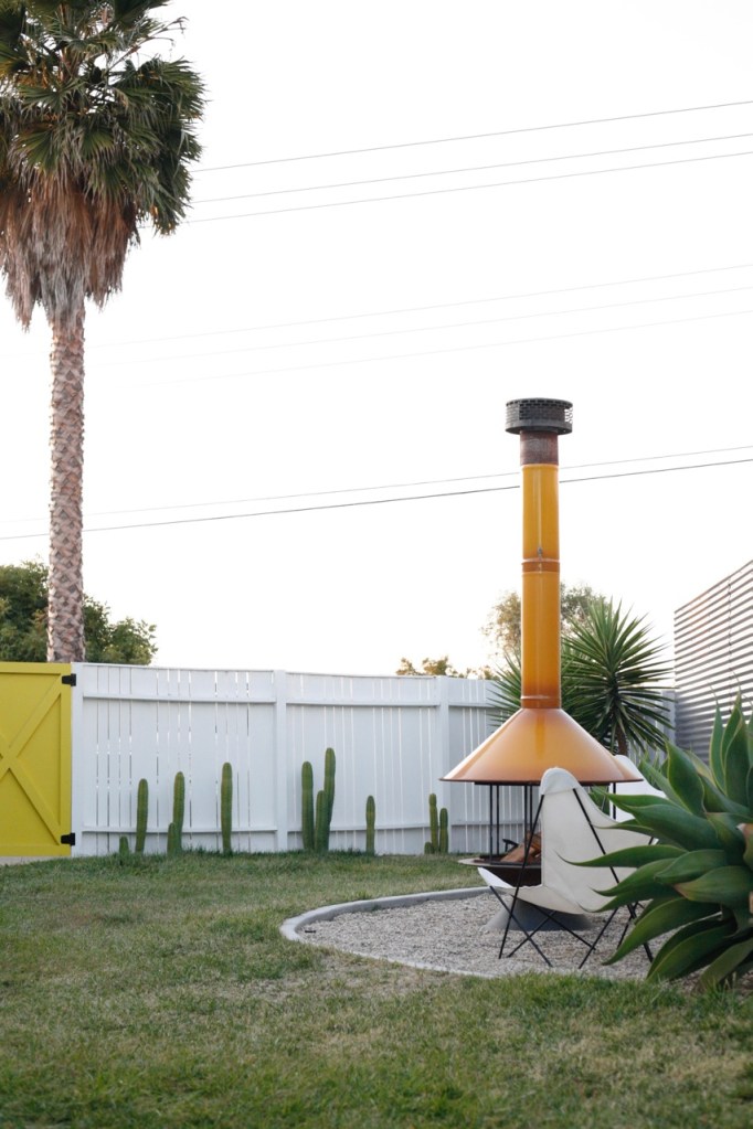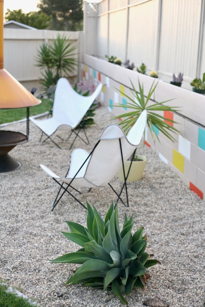 mid century backyard with vintage butterfly chairs fireplace and corrugated fenceWe have been anxious to replace our backyard fence since the day we bought our house six years ago. You can see kinda where we started in this post. Those images are overly generous. In real life, the scene was utter fence clutter. We started thinking about this project last fall when the house was painted and it’s taken a full year to nail down a plan and persevere through the logistical challenges. I can’t believe we even have a fence, let alone a desert modern vibing fence that I love! The projects that are the worst to push through are often the most satisfying, and this backyard fence is taking top awards in both categories!