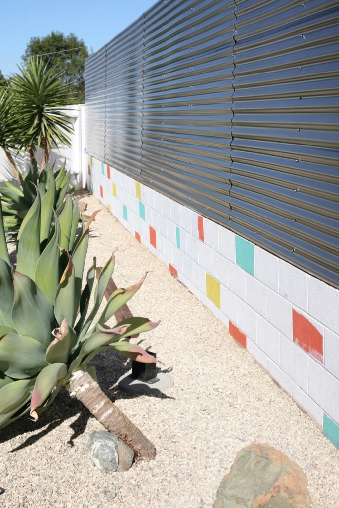 modern corrugated fence DIY vintage orange malm preway carousel fireplace in modern backyardDIY modern corrugated polycarbonate fence backyard mid century modern corrugated fence on top of retaining wall mid century modern backyard landscaping DIY modern corrugated polycarbonate fence backyard mid centuryA brief history of our fence situation: We live on a hill so a 120′ long cinderblock retaining wall runs the length of our property in back. Originally, metal posts were set into that wall to hold up a slat wood fence in the backyard. Twenty years ago, when previous owners declined to go halfsies with our neighbors on replacing that original fence, our neighbors installed their own fence 18″ back from the property line (the lattice one). Next, the previous owners of our home liked the neighbor’s new fence better than the original fence on the wall so they cut down the posts across half the yard, while leaving half remaining on the side yard (best seen in photos of our sideyard here). All this left the backyard with confusing layer of fences:By the time we took ownership of the house, the remaining stretch of original fence was bending from the weight of accumulated earth on top of the retaining wall – not at all it’s intended purpose. We had no idea what to do with this mess. Going halfsies on a new fence with our neighbors didn’t pan out – and the setback is odd from our side anyways. Our best course of action seemed to be to replace the original fence on the retaining wall across the entire length of our backyard/sideyard but we were hesitant to add weight on top of the 70 year old, slightly tilting (eek!) wall, and any design would also need to address the retaining overflow problem:Ultimately, we decided to go with a system of post bases bolted into the cinderblock with a stepped retaining system built into the back side, and a fence frame on the front.In our pursuit of a lightweight material for the fence, we took a chance with an experimental option: corrugated polycarbonate. It gave us the modern look of corrugated metal, but was extremely lightweight, perfect for our situation. (Bonus: it comes in a crazy bright orange color that we almost went with…see more in saved IG stories!) Our unique fence requirements were: 1. privacy, not necessarily strength 2. a modern aesthetic 3. lightweight materials and 4. a design that could incorporate additional retaining strength above the wall (ugh). With 100′ of fence line, we preferred a cheaper material and one that was low maintenance, but were willing to compromise on both to meet the needs. We considered redwood slats, privacy bamboo, corrugated metal, and so much more (canvas panels! vining plants! even vinyl fencing!) but kept circling back to corrugated polycarbonate. It checked all our boxes, plus should theoretically be extremely low maintenance.