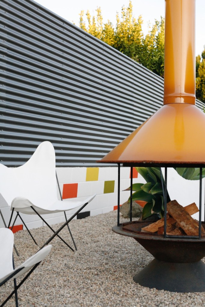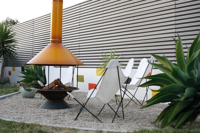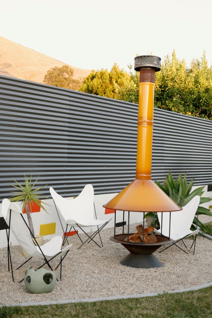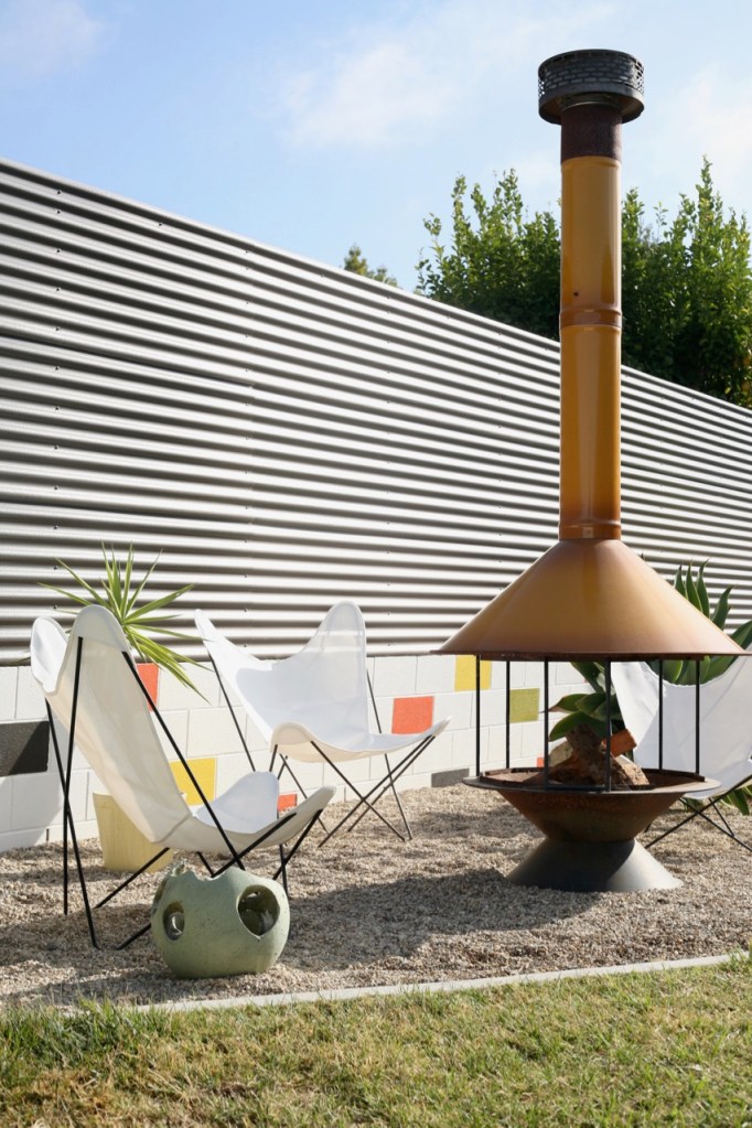 mid century backyard with vintage butterfly chairs fireplace and corrugated fence modern corrugated fence on top of retaining wall modern corrugated fence DIY