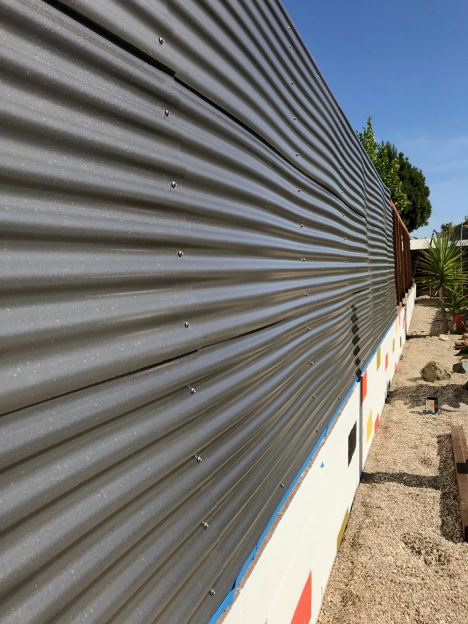 Corrugated polycarbonate is intended to be roofing or siding materials for garden sheds, etc. so this out-of-the-box vertical fence application brought challenges. Although the polycarbonate can supposedly withstand being hit with rocks and baseballs and doesn’t reflect heat in the same way corrugated metal does (yay), it lacks the strength of corrugated metal and, we soon found out, expands in temperatures above 80 degrees – producing visible waves on our fence (no!!!!). It was only noticeable when standing directly next to it looking down the expanse, and always returned to “normal” when the temperatures dropped to their regular mild mid 70’s. But when it was bad, it was bad:Enough so that we started over with a new approach to mitigated the issue: working on only the hottest days, we allowed each panel to warm up considerably in the sun (to reach max expansion) before installing in place. As before, we predrilled holes as recommended and used the suggested screws, but I think that tiny bit of extra wiggle room from the heat canceled out some of the innate human error in hanging process. We now have way less waves, though we still get some on our hottest days (above 90 degrees and, again, only visible from right next to the fence). Considering this, I wouldn’t recommend corrugated polycarbonate as a fence option unless you have our very specific set of issues too: needing a lightweight privacy fence. Otherwise, corrugated metal is a safer bet! But for our purposes, this was an ideal material and I’m so beyond happy with how it turned out! I love the clean, minimal backdrop across our entire property!