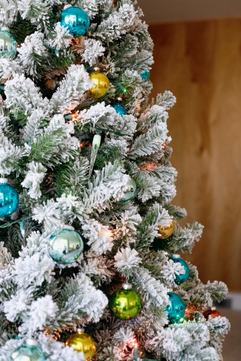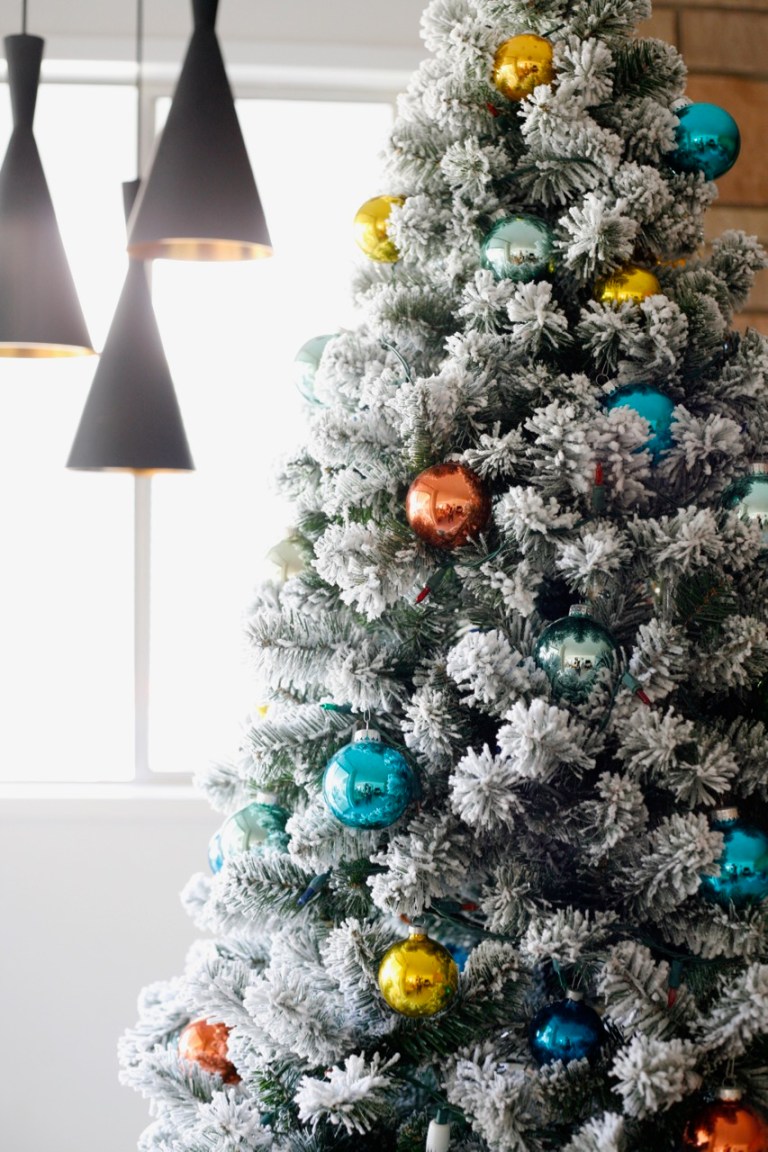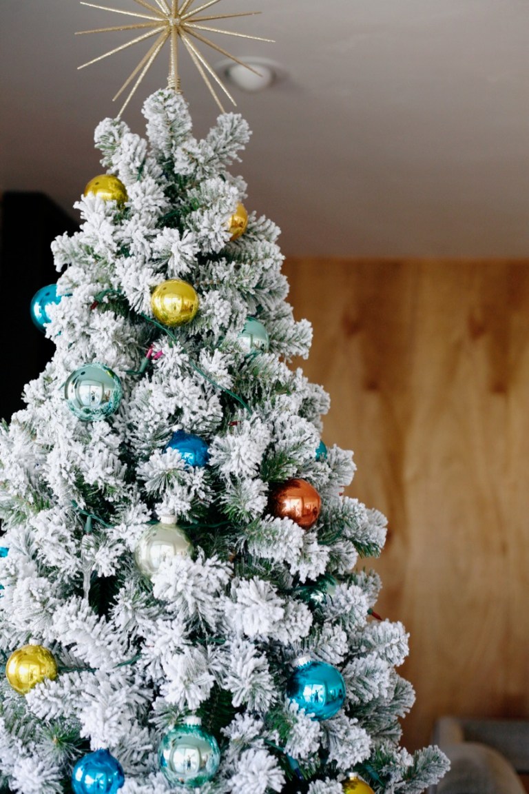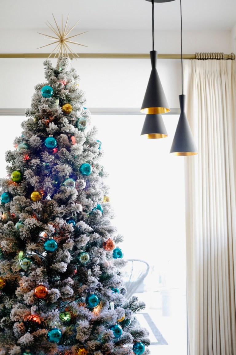 For this tree, I added my usual festive but minimal-leaning adornments. I’m the person that loves decorating for Christmas/hoarding vintage Christmas items, but can be driven crazy by clutter and will be packing up extra stuff mid December if I go too overboard. So I keep everything, including the tree, bold but simple. I channeled a retro 60’s vibe using bright vintage glass ball ornaments and old school colored lights.