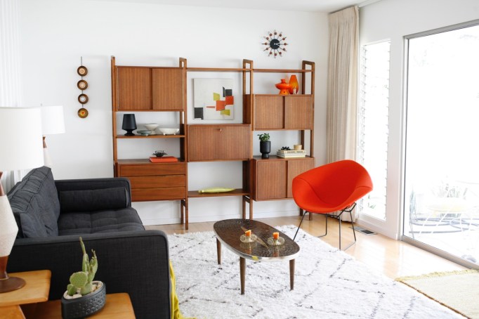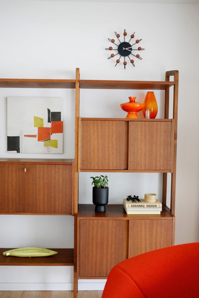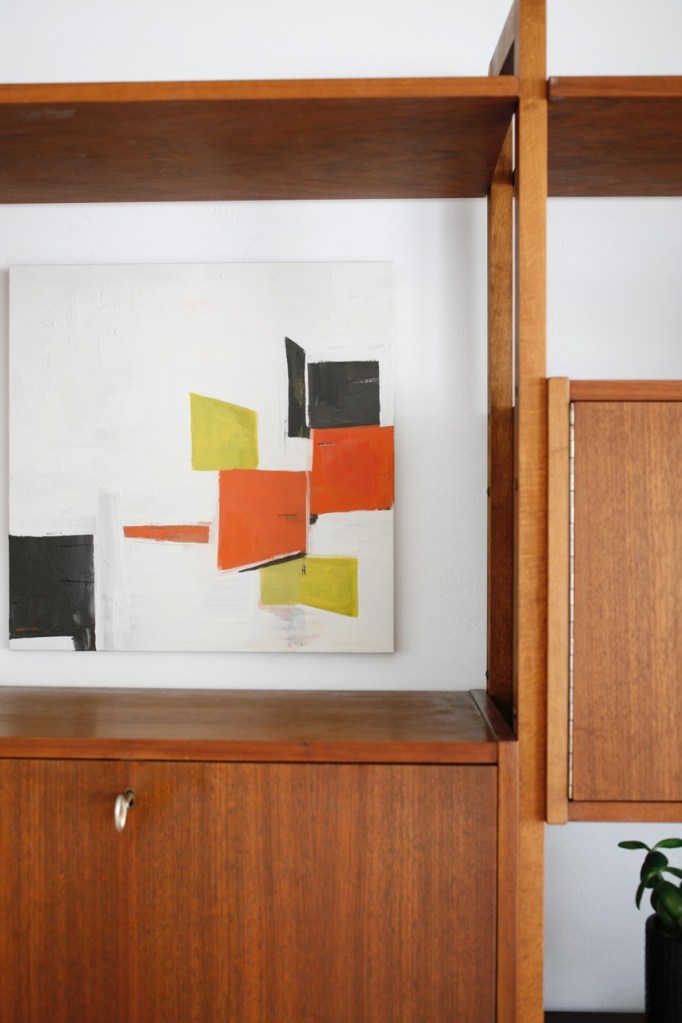 The previous owners emailed us a few months ago saying they had found another cabinet that goes to the wall unit in our den and they were kind enough to deliver it to us. We didn’t get around to screwing in the long lost missing piece until a few weeks ago, and I was majorly missing the presence of a colorful painting in the mix so I whipped up something small to fit between the shelves. When my schedule majorly opened up this weekend I finished reshuffling my crap around the shelves until it felt right. (You can see more of this room here)