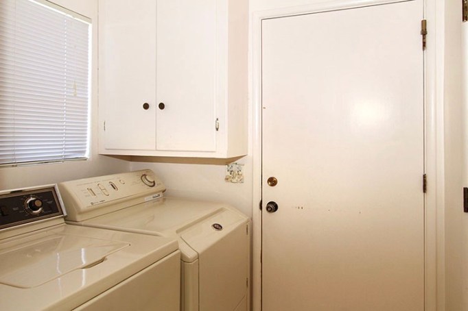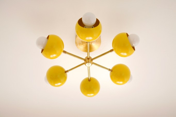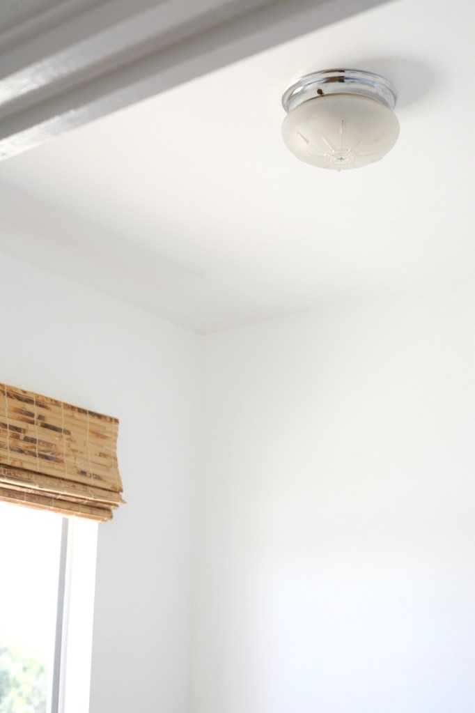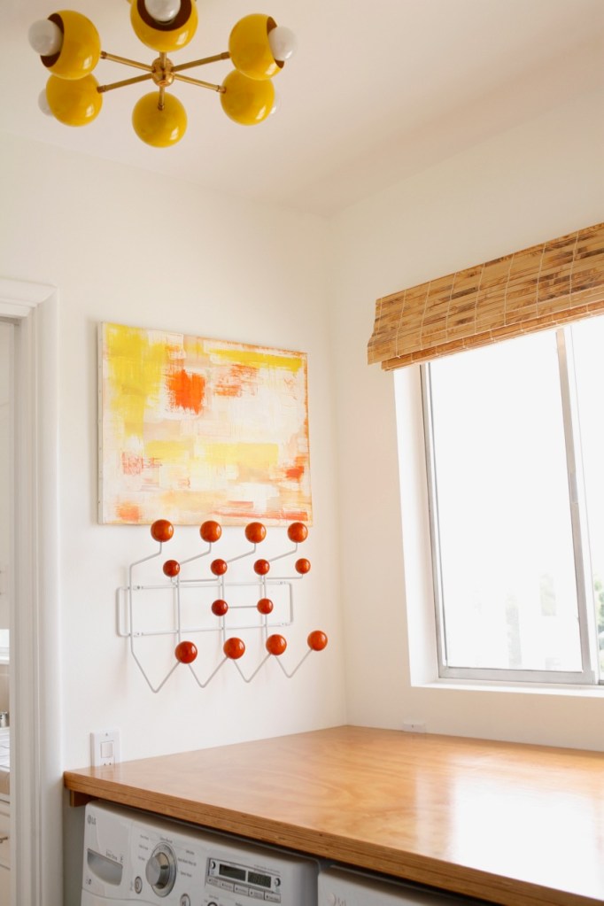 The light we replaced, original to the house, was a glass flushmount with a subtle starburst design. It was fine and did the job – probably why we kept it around so long – but it definitely was not substantial enough to make any big impact on the room. I like to keep a minimal and uncluttered laundry room both for function and for clear sight lines from the kitchen (we usually have enough dirty dishes hanging around to fill all mental space haha!). Adding a pop of color and an interesting shape to the ceiling is the best thing – and a reason why lights are my FAVORITE addition to a room. And the only jewelry I want! They add so much visual interest without any extra stuff! Ahhhh I love it so much…